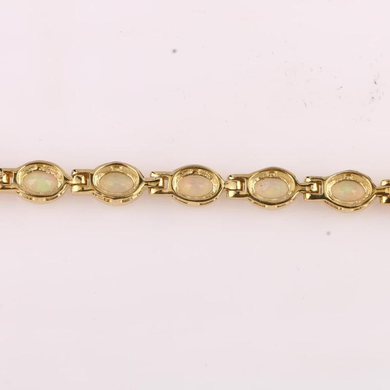 Indulge in the ethereal beauty of this exquisite Ethiopian Opal bracelet, featuring 17 perfectly crafted oval stones, each measuring 6x4mm. These opals are renowned for their captivating play-of-color, showcasing a mesmerizing dance of iridescent hues that shift and shimmer with every movement.
