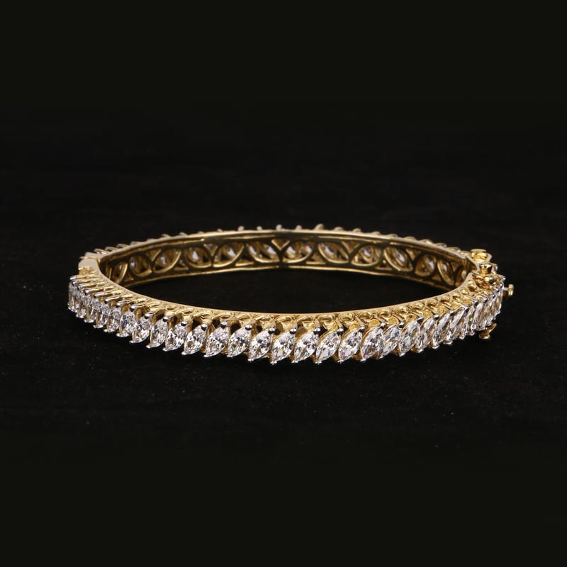 Crafted with precision and a keen eye for detail, the bangle features an openable design that seamlessly combines convenience with style. The shimmering marquise crystals, renowned for their brilliance and clarity, are set in a radiant arrangement that captures and reflects light with every movement, creating a captivating aura around the wearer.