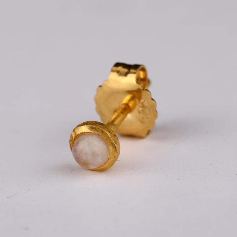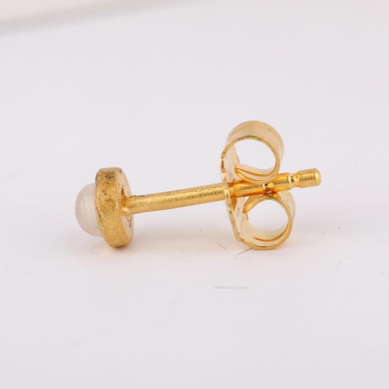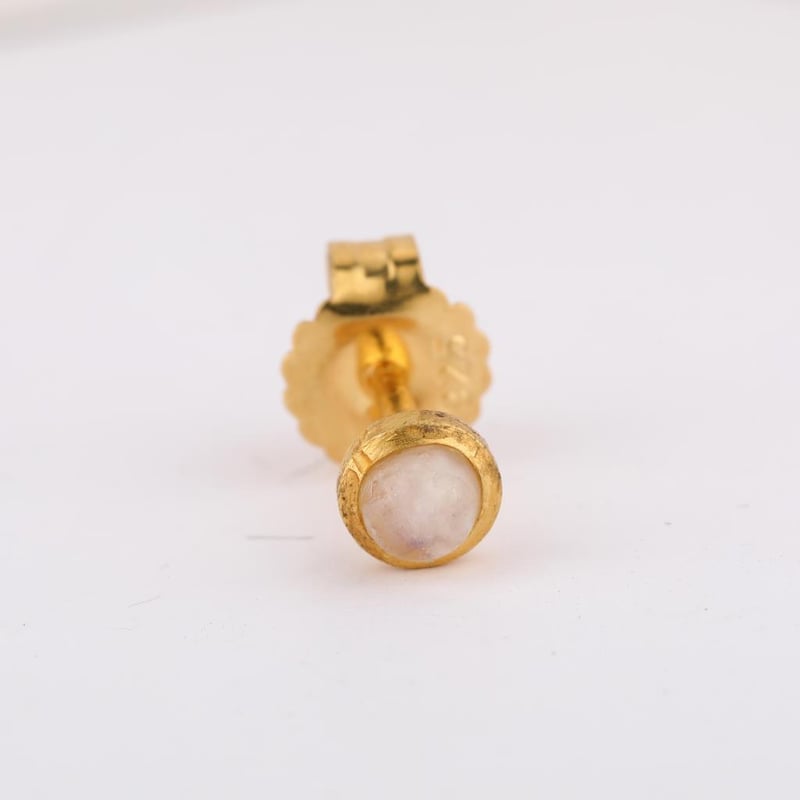 Elevate your elegance with these mesmerizing earrings featuring two exquisite 3.00mm round White Rainbow Moonstone cabochons. Each stone is a masterpiece of nature, showcasing a captivating play of light with subtle flashes of ethereal color that dance across its surface. The matte finish enhances their mystical allure, offering a modern twist to the classic gemstone.