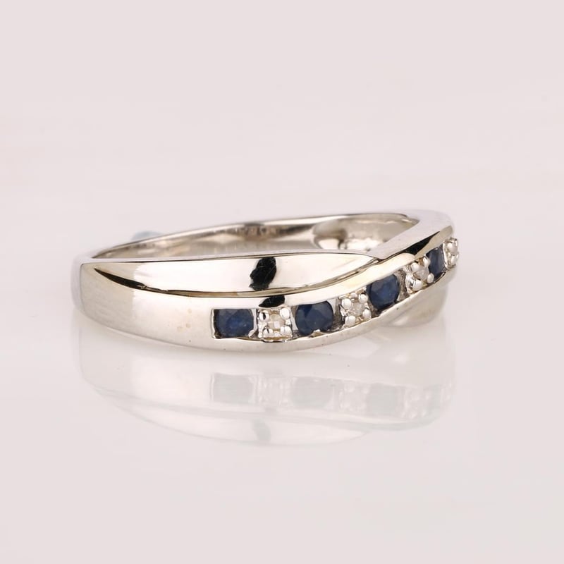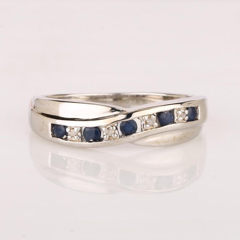 Indulge in the ethereal beauty of this meticulously crafted ring, showcasing a harmonious blend of five radiant blue sapphires, each ranging from 2.10 to 2.20mm, and four dazzling white diamonds, each perfectly cut at 0.90mm. This enchanting piece is a testament to nature's artistry, with the sapphires embodying the tranquil depths of a twilight sky, their rich hue evoking a sense of serenity and elegance.