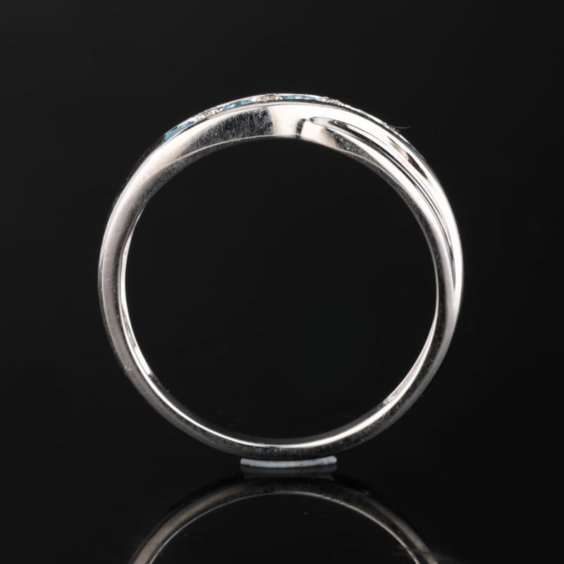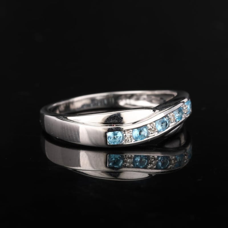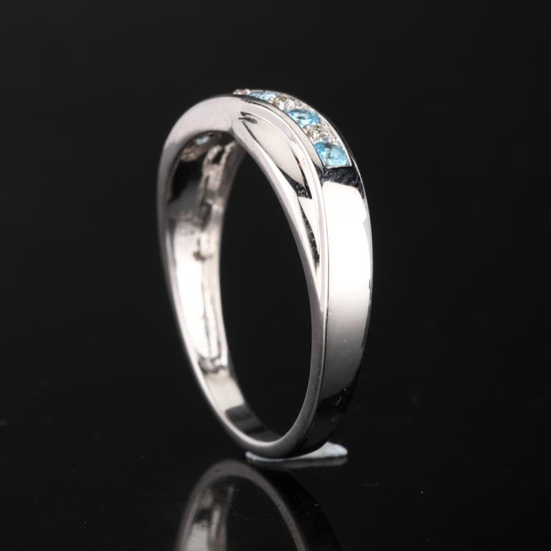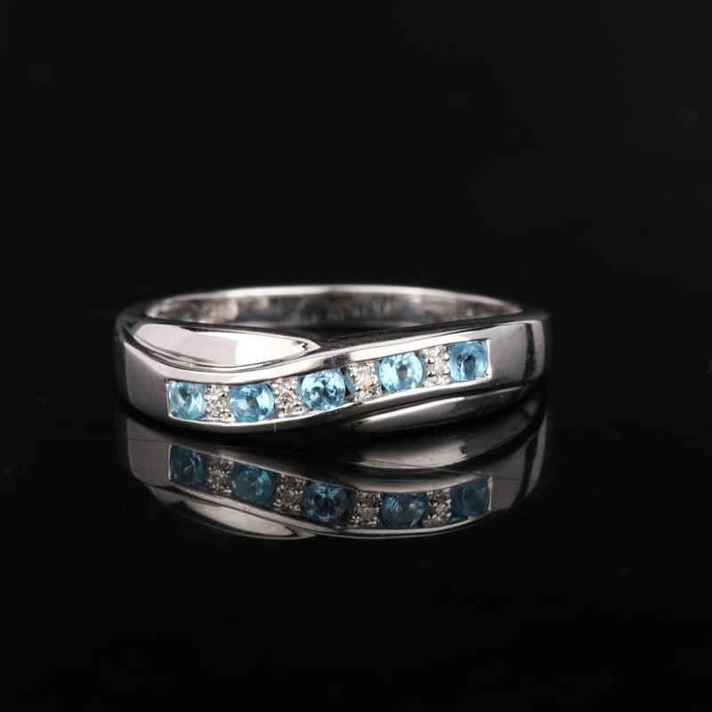 Adorning this collection of topaz are four meticulously selected white diamond accent stones, each 0.90mm in size. The diamonds are expertly set to enhance the ring’s overall brilliance, reflecting light with every movement. Together, the combination of these exquisite gems creates a stunning contrast, accentuating the deep blue tones while adding a touch of timeless elegance.