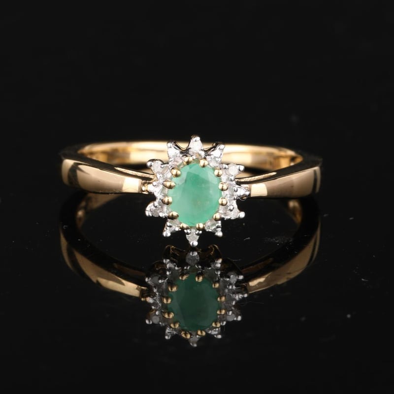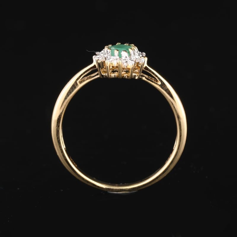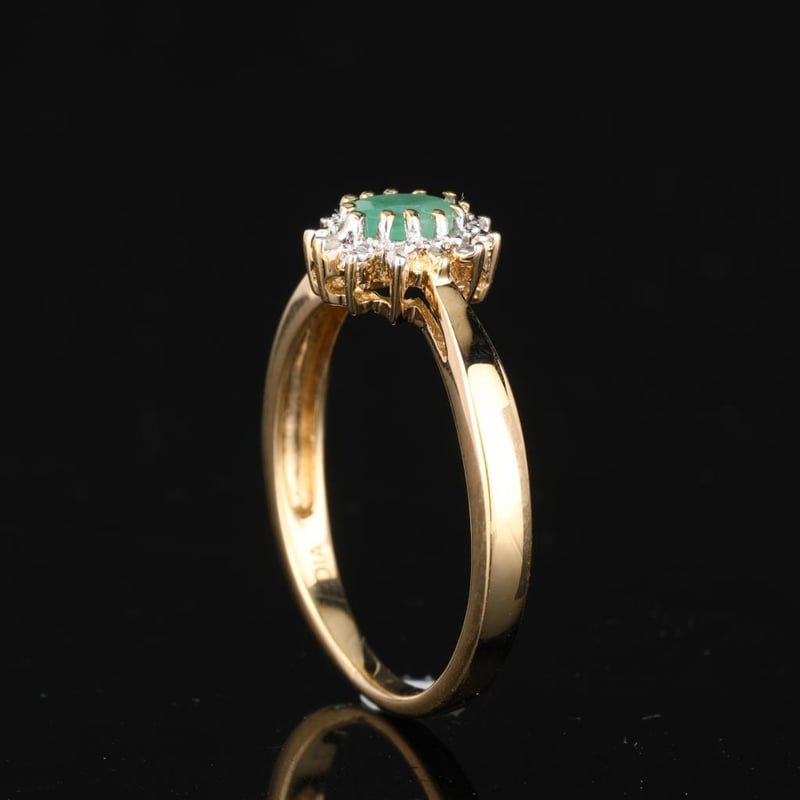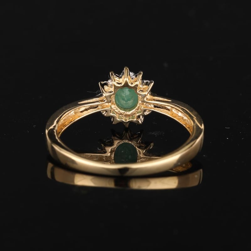 Indulge in the exquisite allure of this stunning ring, a true masterpiece that harmoniously blends the rich depths of medium-colored emerald with the sparkling brilliance of white diamonds. At its heart lies a mesmerizing oval emerald measuring 5x4mm, radiating a lush green hue that evokes the enchanting beauty of a tranquil forest.