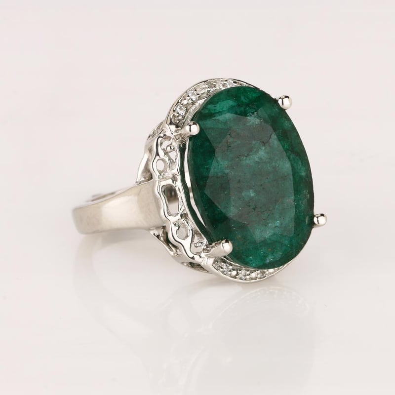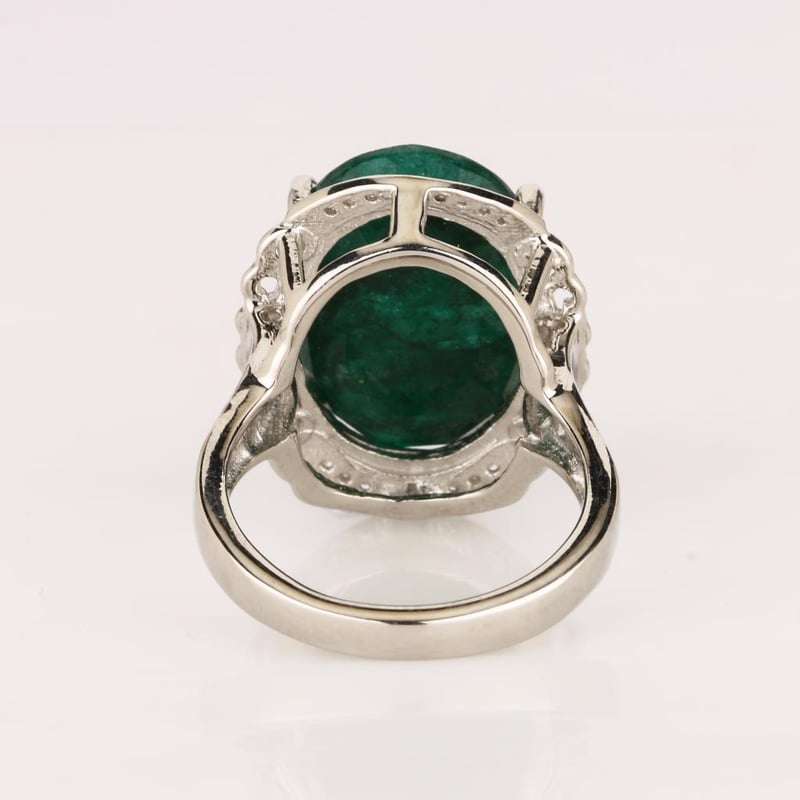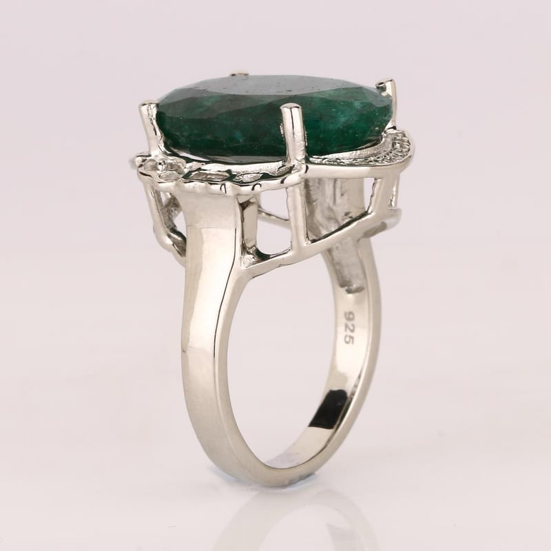 Crafted with meticulous attention to detail, the ring showcases the emerald as its centerpiece, drawing the eye with its rich coloration and unique character. The shimmering white topaz accents frame the emerald beautifully, enhancing its brilliance and illuminating the entire design with a touch of luxury.