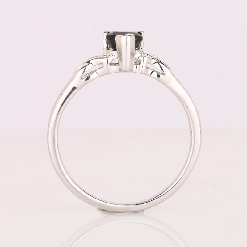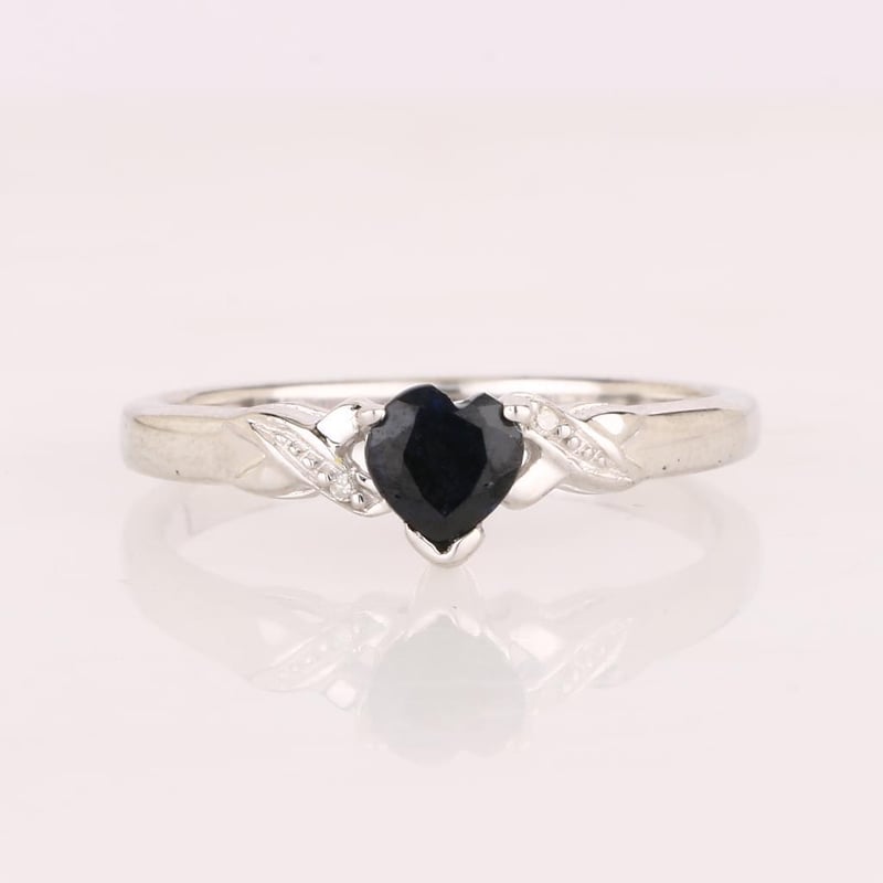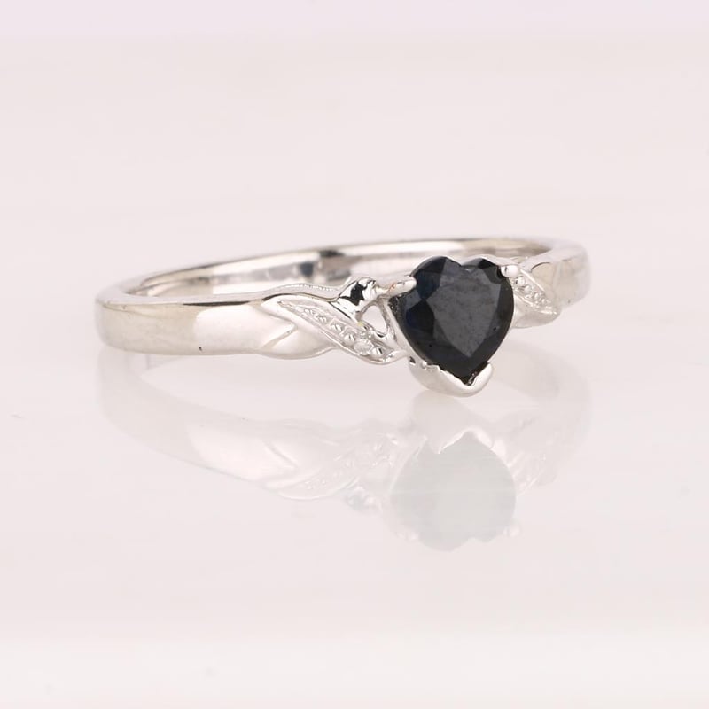 Indulge in the exquisite allure of this stunning ring, featuring a captivating heart-shaped black sapphire measuring 5.00mm. This striking gemstone, with its deep, mysterious hue, embodies the essence of elegance and sophistication, making it a perfect symbol of love and devotion. Flanking the central sapphire are two scintillating round white diamonds, each 0.90mm, adding a brilliant touch of sparkle that beautifully contrasts with the dark allure of the sapphire.