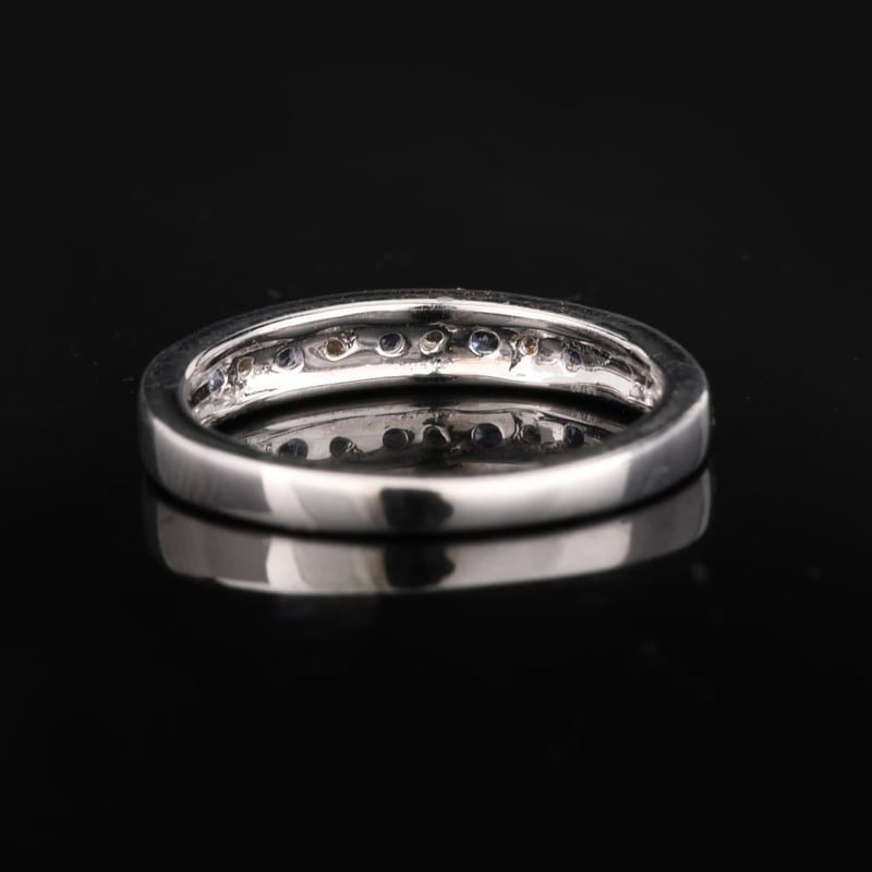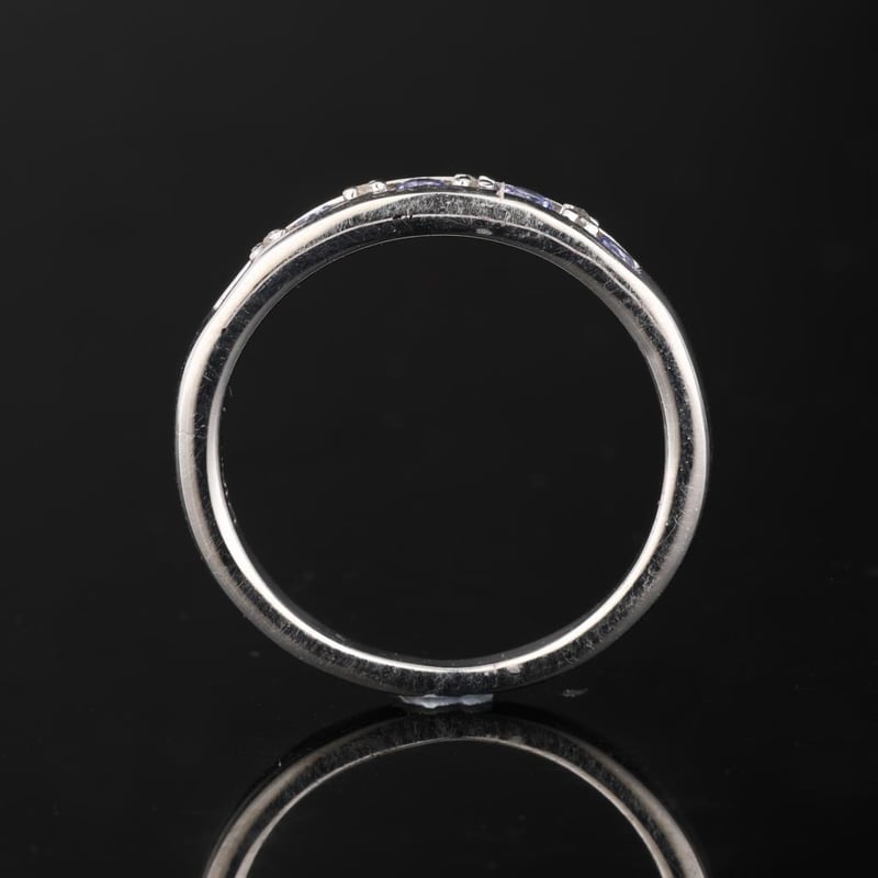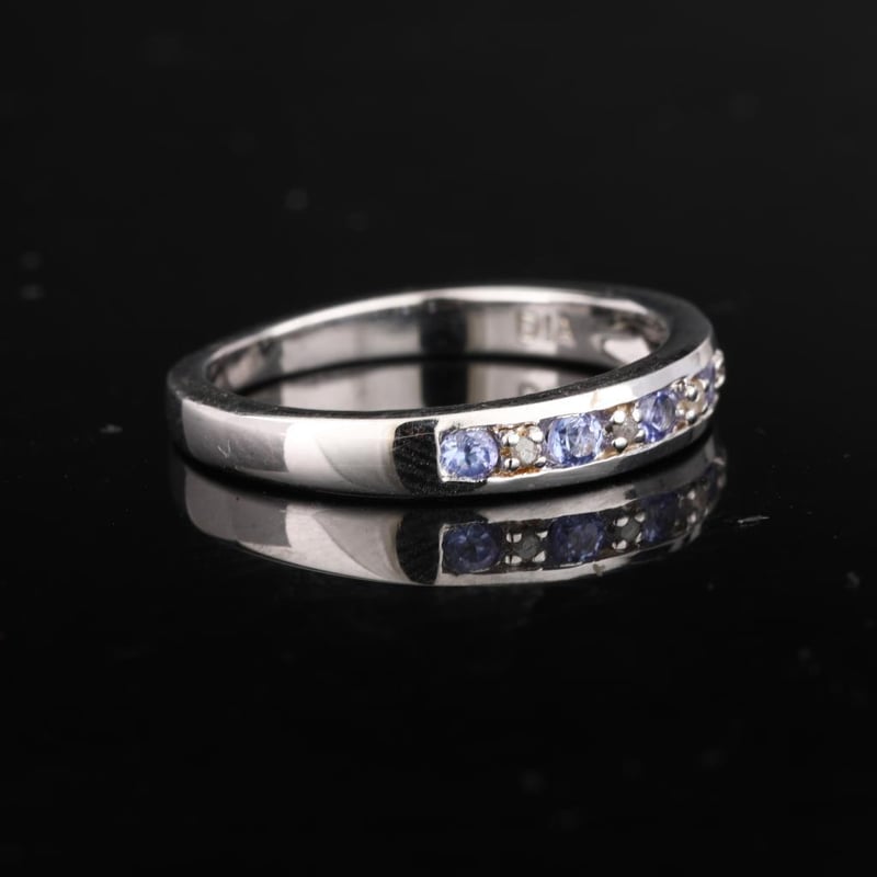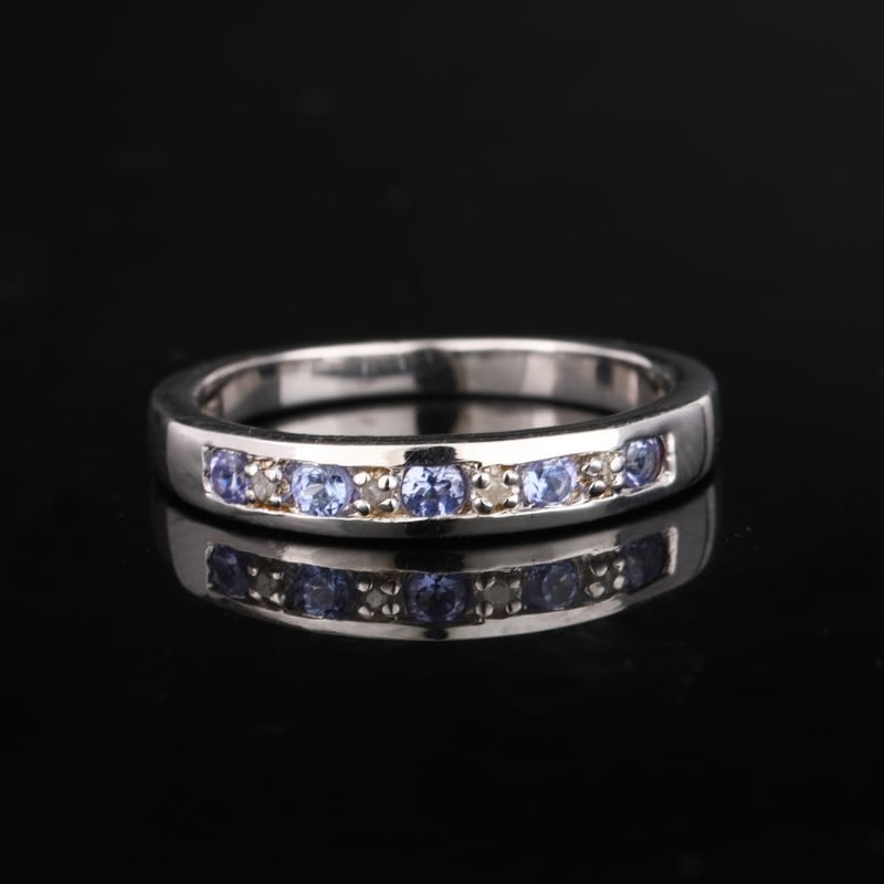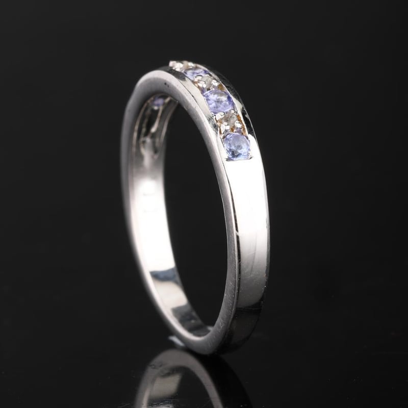 Indulge in the captivating allure of this exquisite ring, a harmonious blend of vivid tanzanite and shimmering white diamonds that epitomizes elegance and sophistication. At the heart of this stunning piece are five round tanzanite gemstones, each measuring 2.00mm, displaying a mesmerizing deep violet-blue hue that captures the light and enchants the eye. These rare gems are complemented by four sparkling round white diamonds, each 0.90mm, which add a touch of brilliance and radiance, effortlessly enhancing the ring's overall allure.