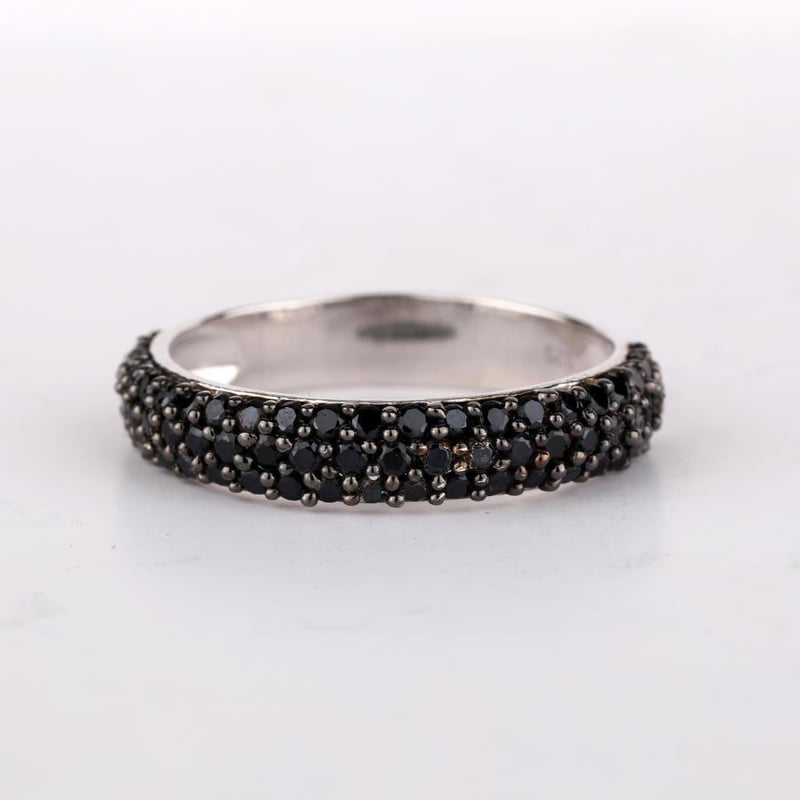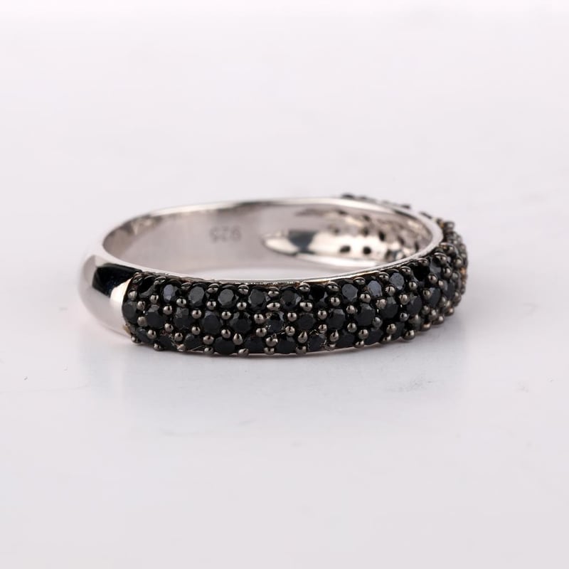 Set in luxurious black pan rhodium, the band provides a striking contrast that enhances the rich, dark tones of the spinel, making it a perfect accessory for both everyday wear and special occasions. The half band design offers a modern twist, allowing for comfortable wear while showcasing the brilliance of each stone.