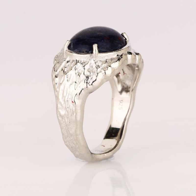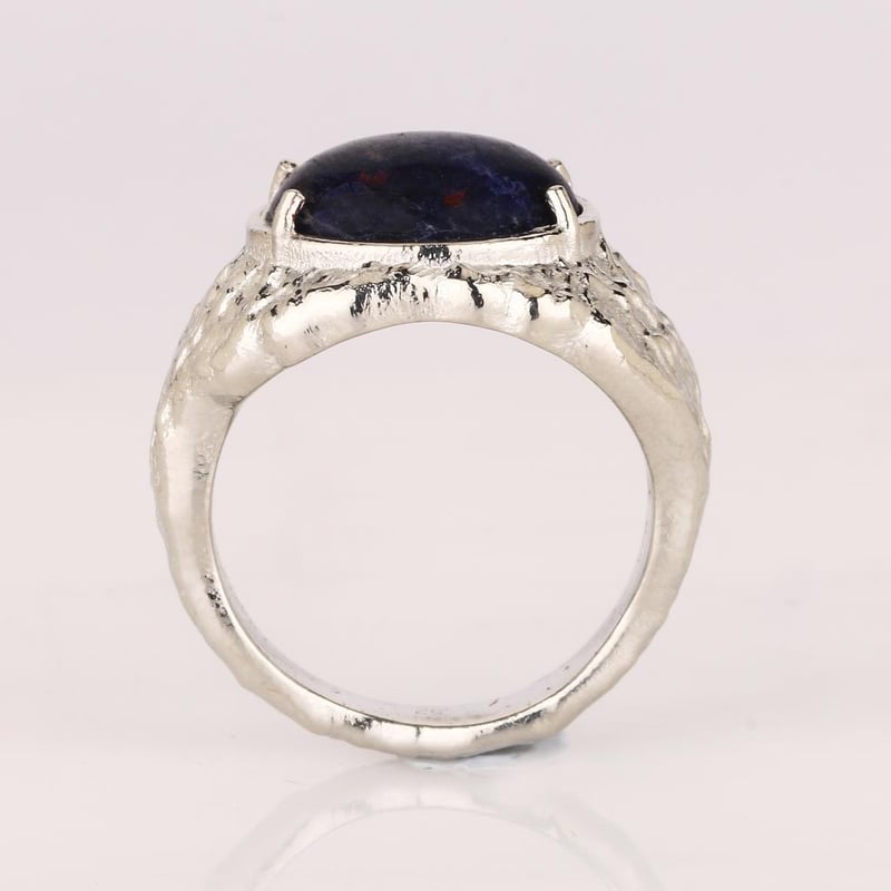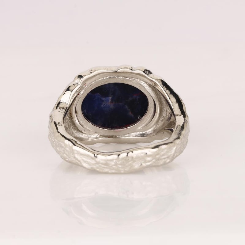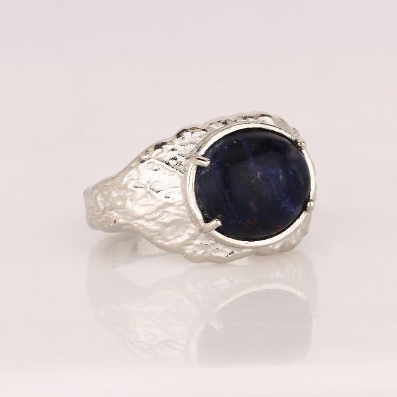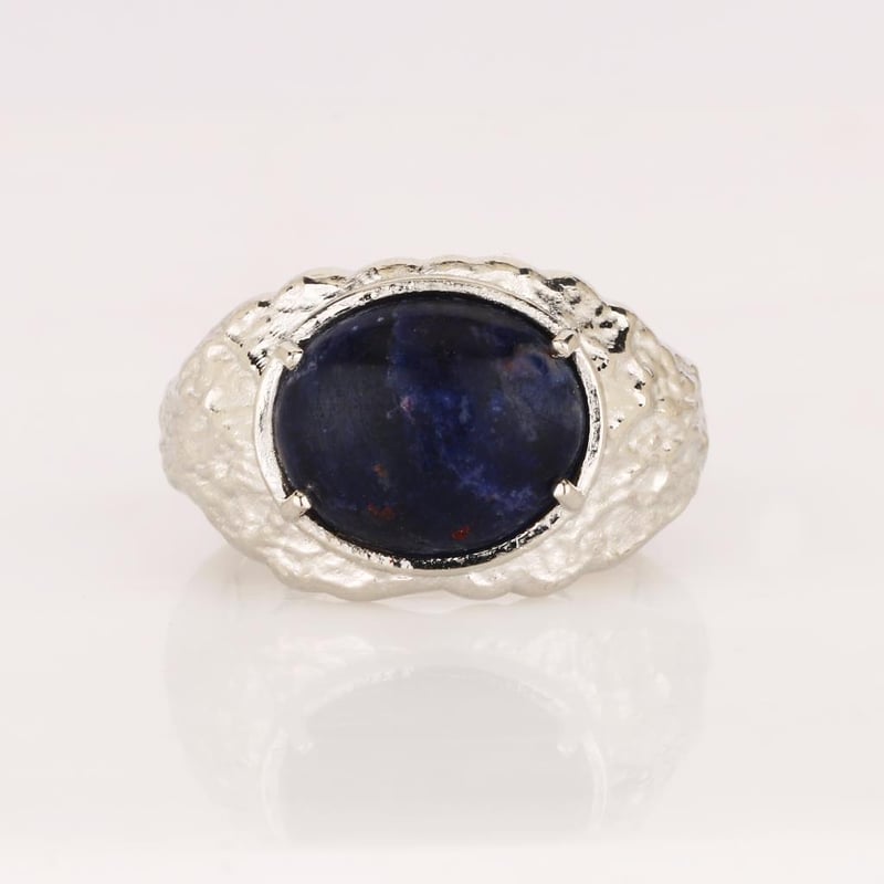 This ring is more than just an accessory; it is a conversation starter, a symbol of sophistication, and a celebration of nature's artistry. Adorn yourself with this luxurious piece that embodies confidence and elegance, and let the sodalite's rich tones and the ring's distinctive design transport you to a realm of timeless beauty. Don’t miss the opportunity to own this one-of-a-kind treasure.