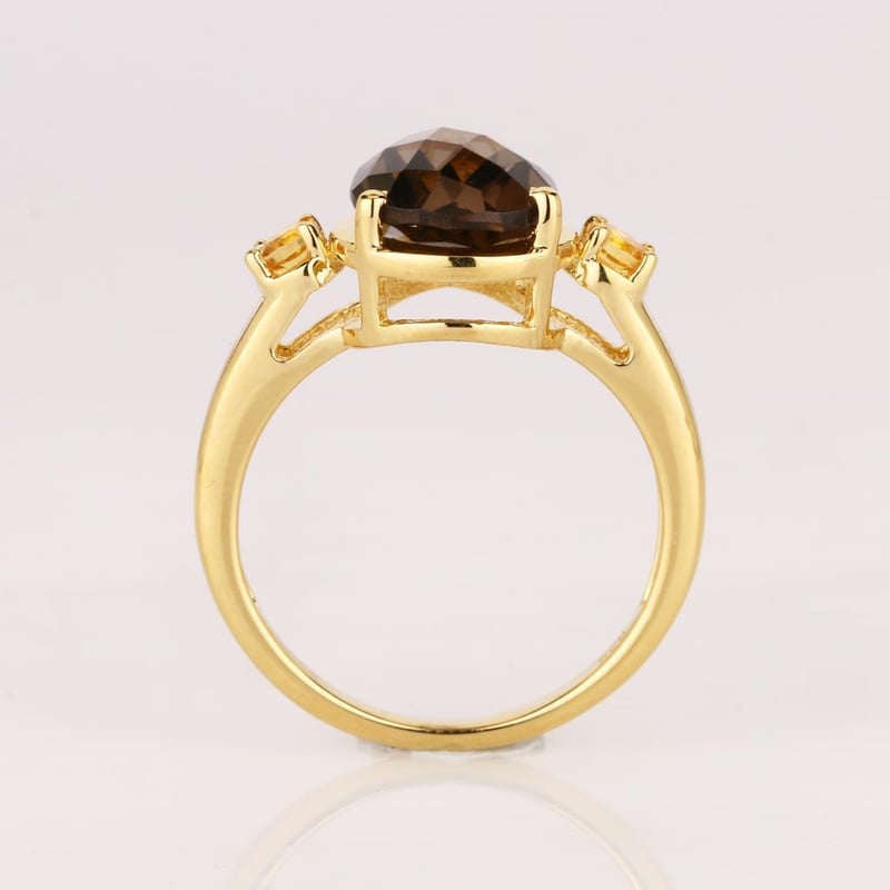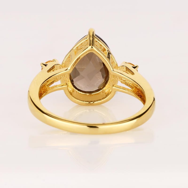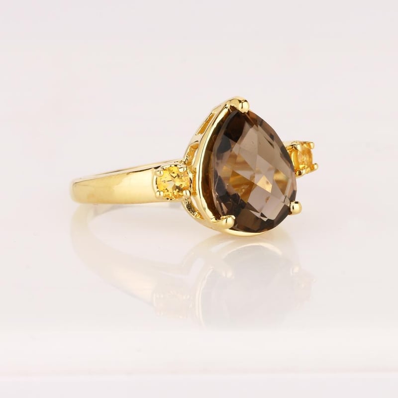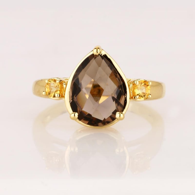 Indulge in the exquisite charm of this stunning ring, featuring a captivating 12x9mm Smoky Quartz Briolite Pear nestled gracefully at its center. The rich, earthy tones of the smoky quartz evoke the warmth of a twilight sky, offering a sophisticated allure that contrasts beautifully with the vibrant sparkle of two 3.00mm Citrine rounds, artfully placed to either side.
