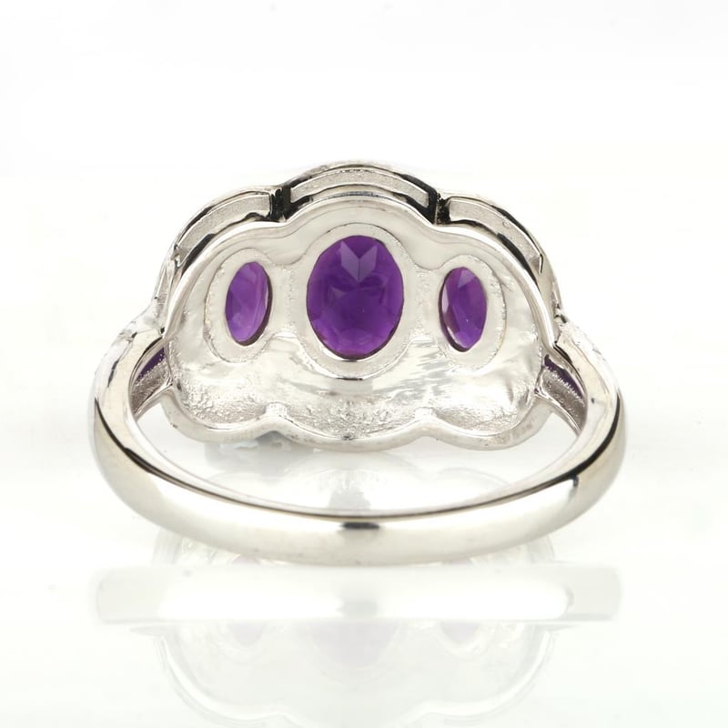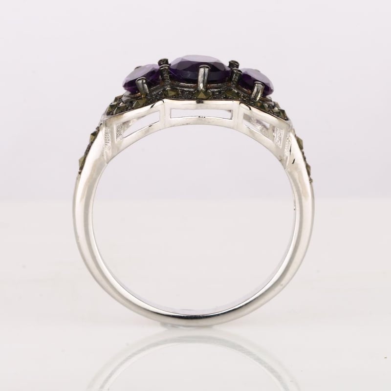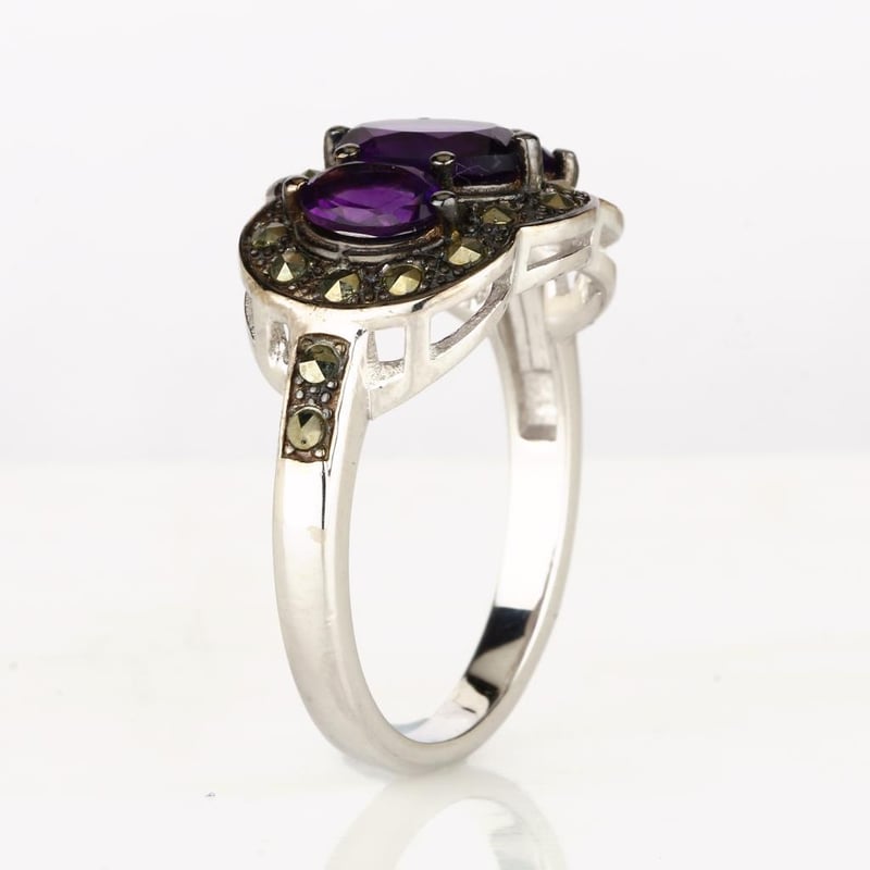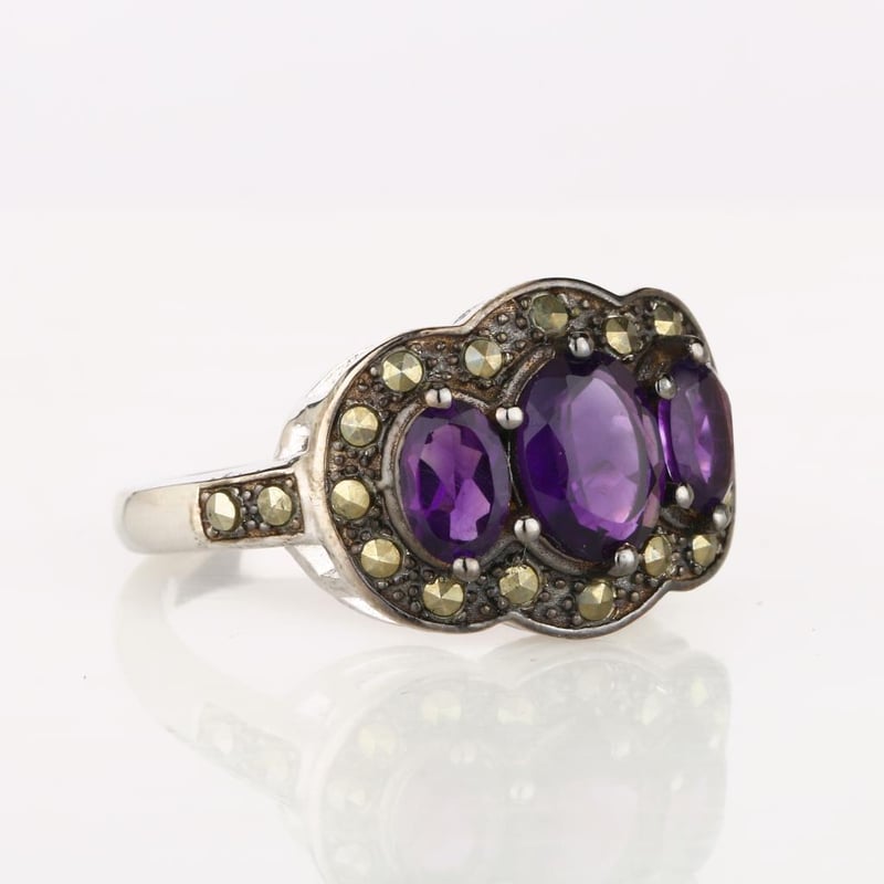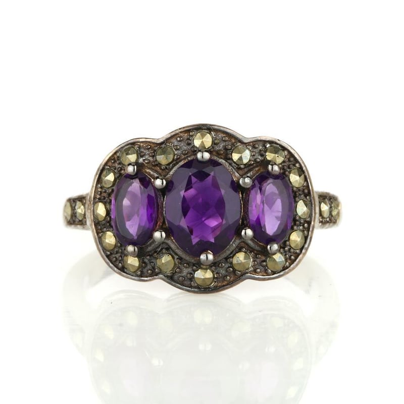 Indulge in the allure of this stunning ring, featuring a harmonious blend of African amethyst and marcasite that captures the essence of elegance and sophistication. At its heart, a captivating oval African amethyst gemstone, measuring 8x6mm, radiates a rich, deep violet hue, evoking the mystique of twilight skies. Flanked by two smaller oval African amethyst stones, each measuring 6x4mm, this piece showcases a serene gradient of color that enchants the eye and elevates the spirit.