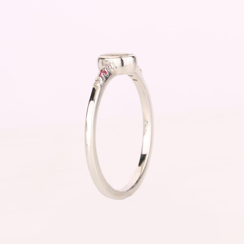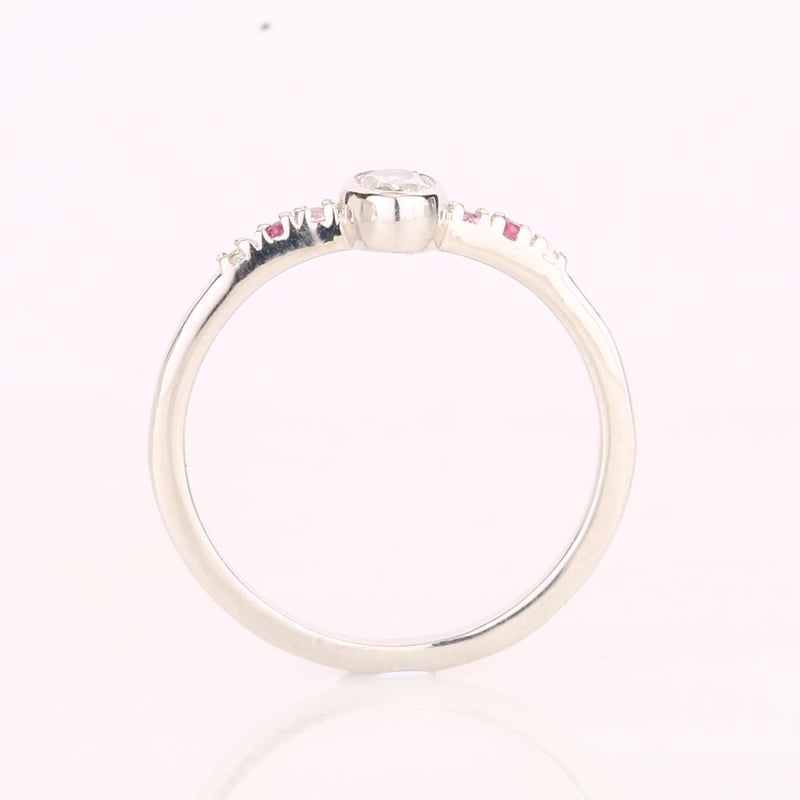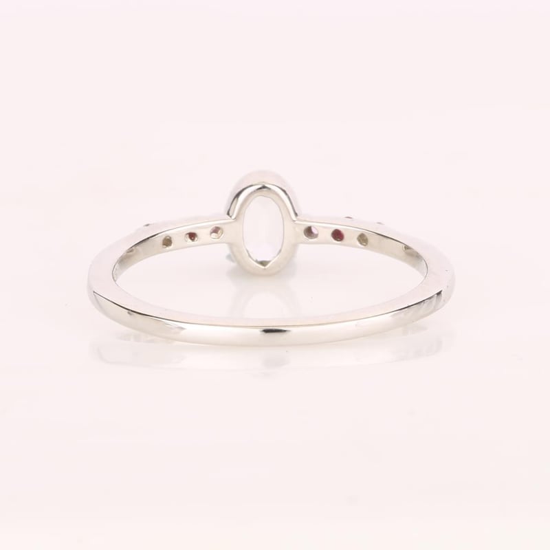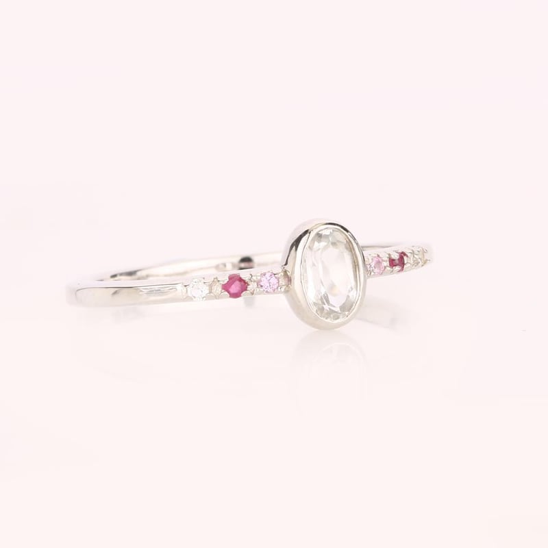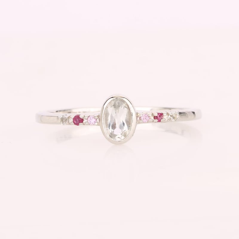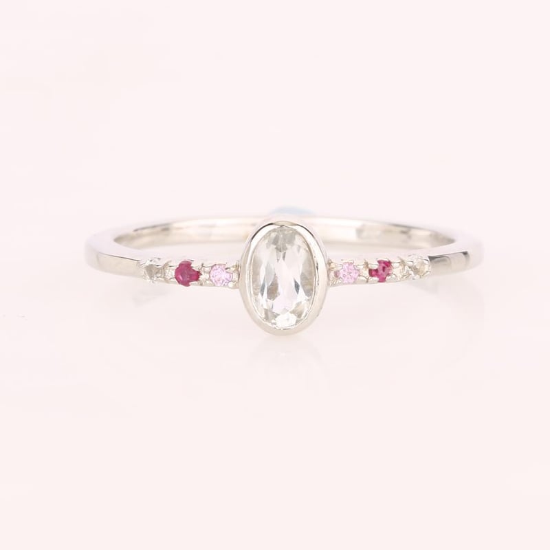 At its heart lies a mesmerizing oval white topaz, measuring 5x3mm, radiating a pristine brilliance that captivates the eye. Framing this centerpiece are two dazzling round pink sapphires, each 1.25mm in diameter, their soft hues whispering of romance and charm. Complementing these vibrant sapphires are two radiant round Bkk rubies, also 1.25mm, their deep red tones adding a touch of fiery elegance. Completing this harmonious design are two additional round white topaz stones, each 1.25mm, enhancing the overall brilliance and creating a perfect balance between the vivid colors.