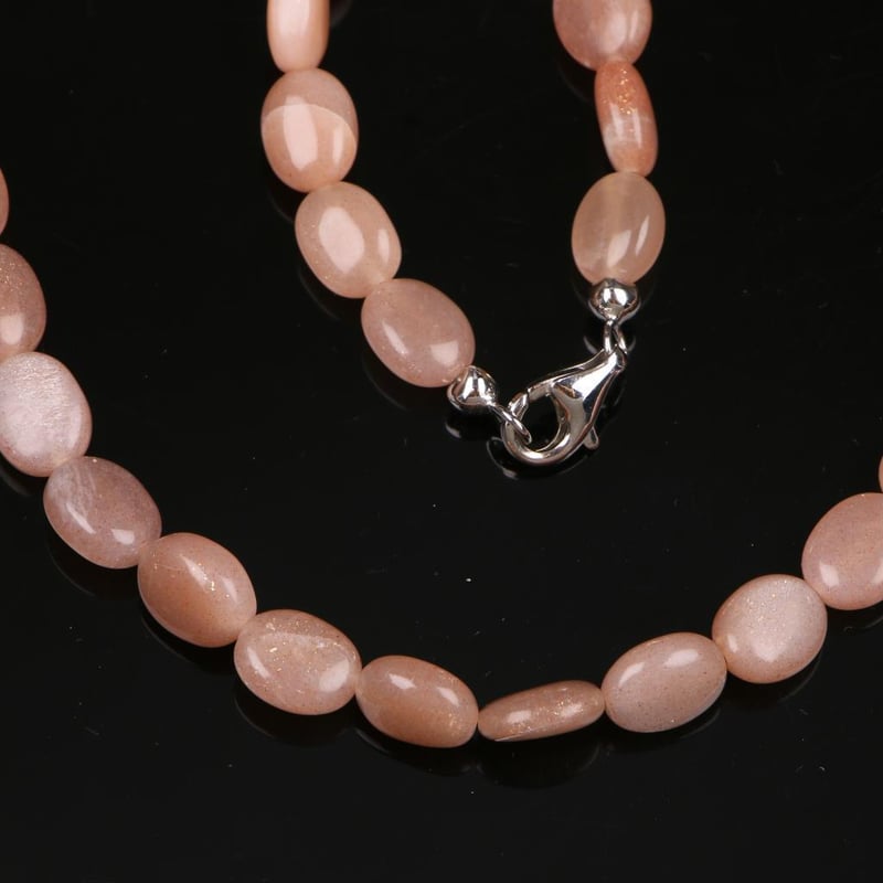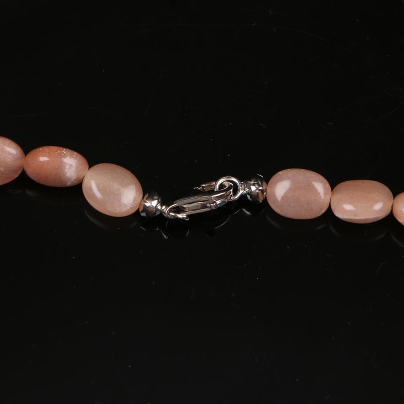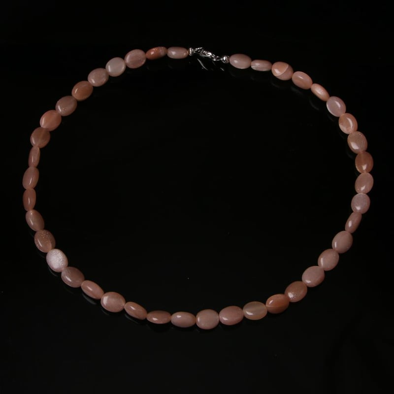 Exquisite Peach Moonstone Beads Necklace with Ghungroo and Fish LockIndulge in the ethereal beauty of this captivating Peach Moonstone Necklace, a stunning assemblage of 41 meticulously crafted beads. Each stone, with its enchanting dimensions of approximately 10.40x8.60mm to 9.60x8.00mm, radiates a soft, peachy glow that captures the light in the most mesmerizing way. The necklace is elegantly designed with a secure 13.00mm fish lock, ensuring both durability and ease of wear, while its playful ghungroo accents add a delightful touch of movement and charm. Perfect for both everyday elegance and special occasions, this exquisite piece embodies grace and sophistication. Adorn yourself with this enchanting necklace and let the allure of peach moonstone elevate your jewelry collection to new heights.