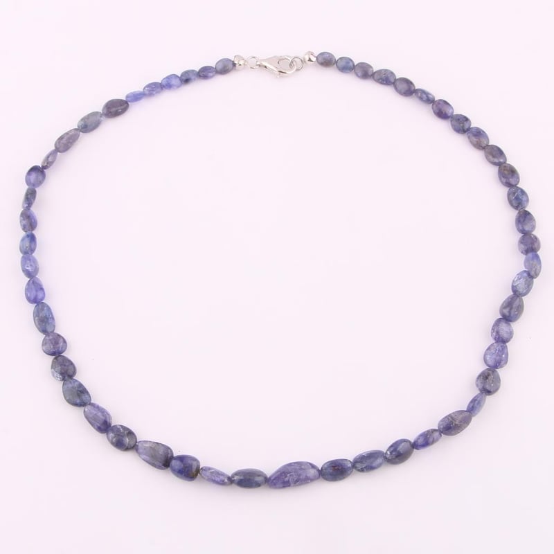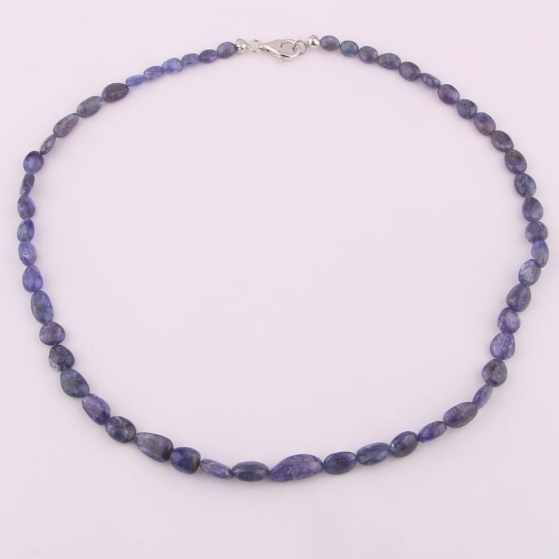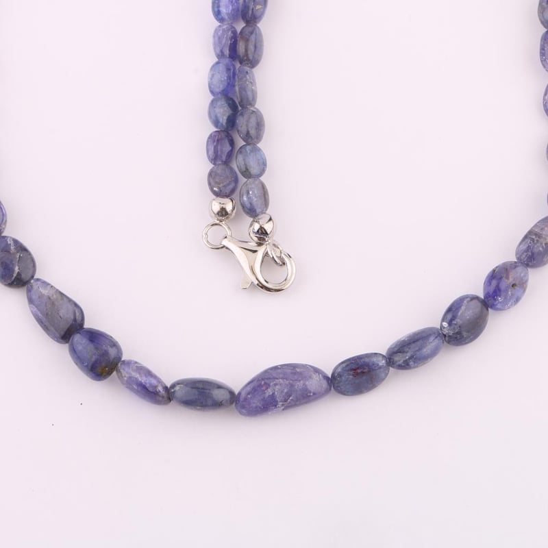 Exquisite Tanzanite Beaded Necklace with Ghungroo and Fish Lock Indulge in the enchanting allure of this stunning Tanzanite Plain Mani necklace, featuring an impressive collection of approximately 58 exquisite pieces. Each bead, ranging in size from 12.40x6.75mm to 5.80x5.65mm, showcases the captivating, deep blue hues and unique character that only Tanzanite can offer. The necklace is elegantly secured with a finely crafted fish lock measuring 13.00mm, ensuring both style and durability. Adorning the design are delicate ghungroo accents that not only add a charming jingling sound but also evoke a sense of traditional artistry. This piece seamlessly blends classic craftsmanship with modern elegance, making it a perfect statement accessory for any occasion. Whether worn on a sophisticated evening out or during a festive celebration, this Tanzanite necklace exudes timeless beauty and sophistication, destined to become a cherished addition to any jewelry collection. Embrace the magic of Tanzanite and let this extraordinary necklace illuminate your elegance.