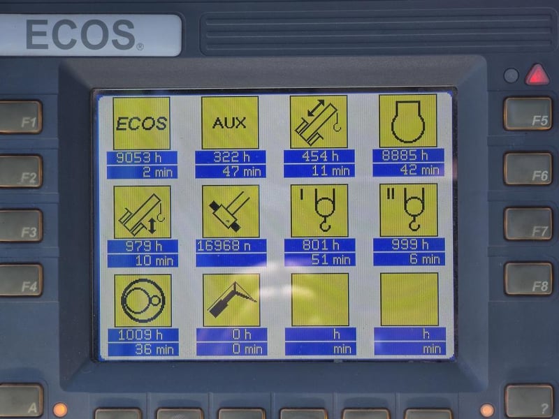 Description: Main multi-sheave hook block, single-sheave whip hook block, rope storage reel (hoist rope spooler), boom-head service platforms, boom-nose roller guards, LED boom-head work lights, A2B anti-two-block safety system, full reeving/sheave setup, tag-line attachment point, fly & needle jib