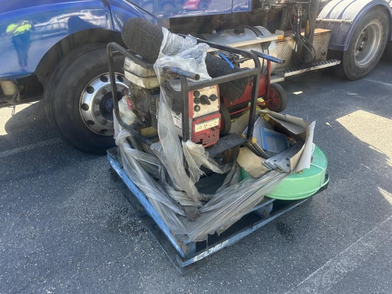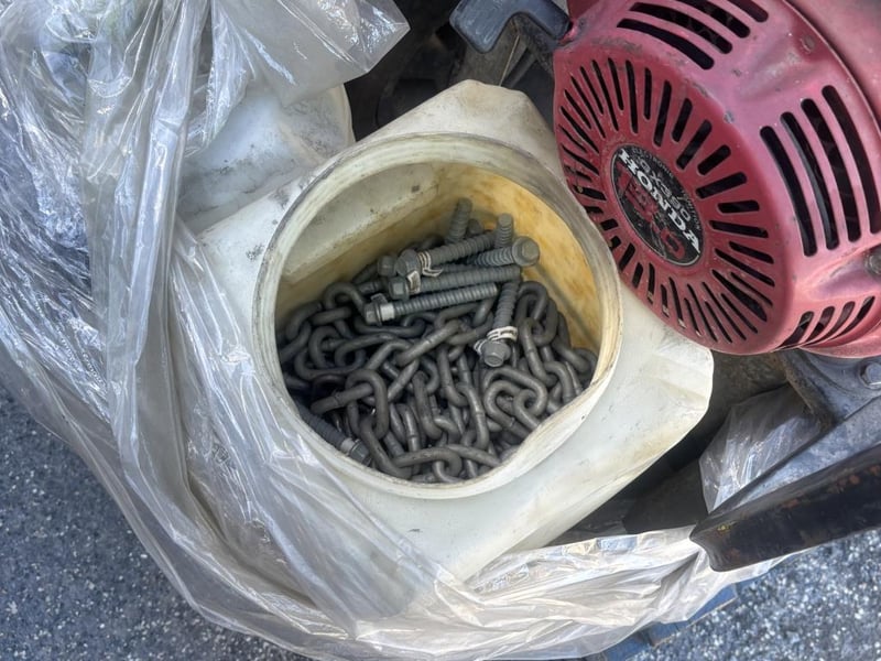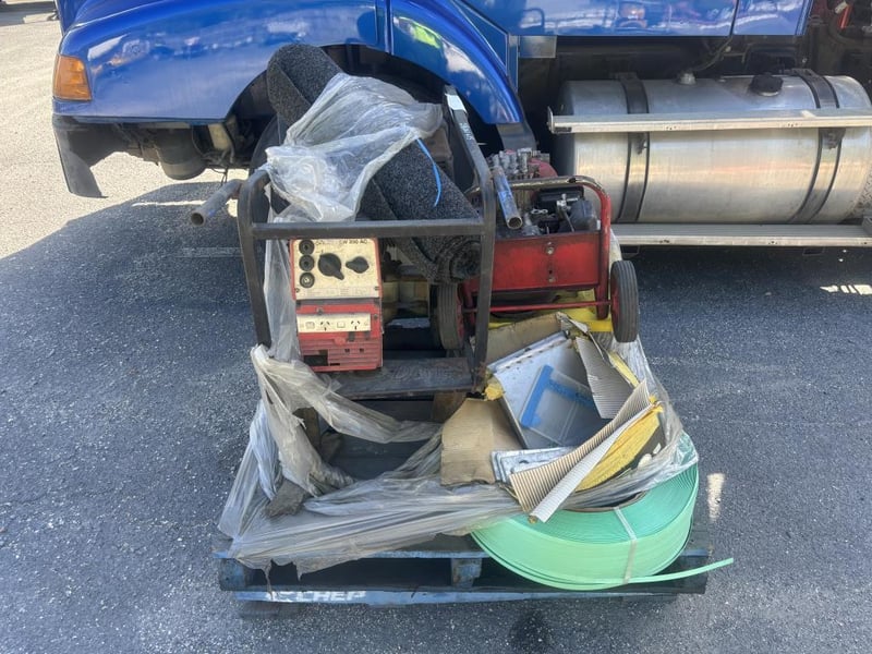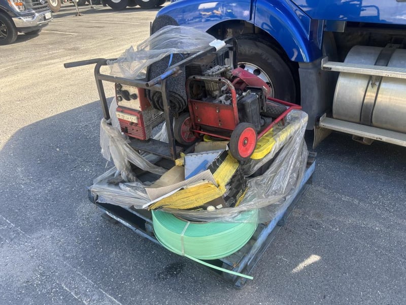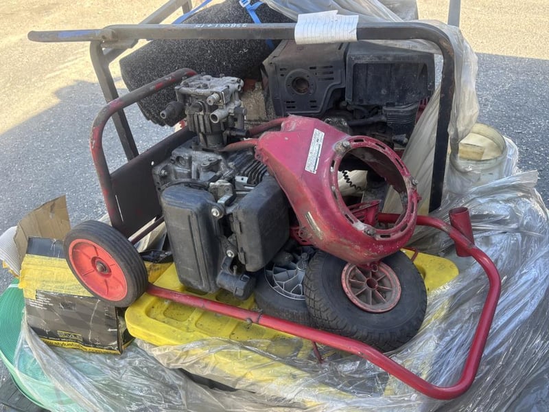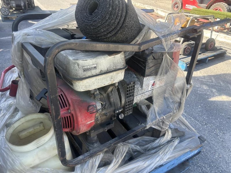 Assorted Lot of Commercial Goods. Including: - Honda GX390 13.0 Generator, EW 200AC, 8.2kw (13hp), 389cc - Generator Cover - Box of Brackets - Roll of Strapping Tape - Bucket of bolts and chains And more Condition: Untested Sold as lot.