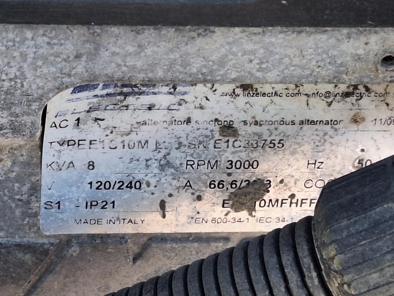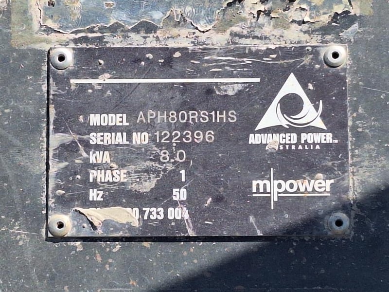 Generator, Advanced Power Australia, M Power Model No: APH80RS1HS Serial No: 122396 kVA 8.0 Phase: 1 Hz: 50 Description: Unknown Working Condition