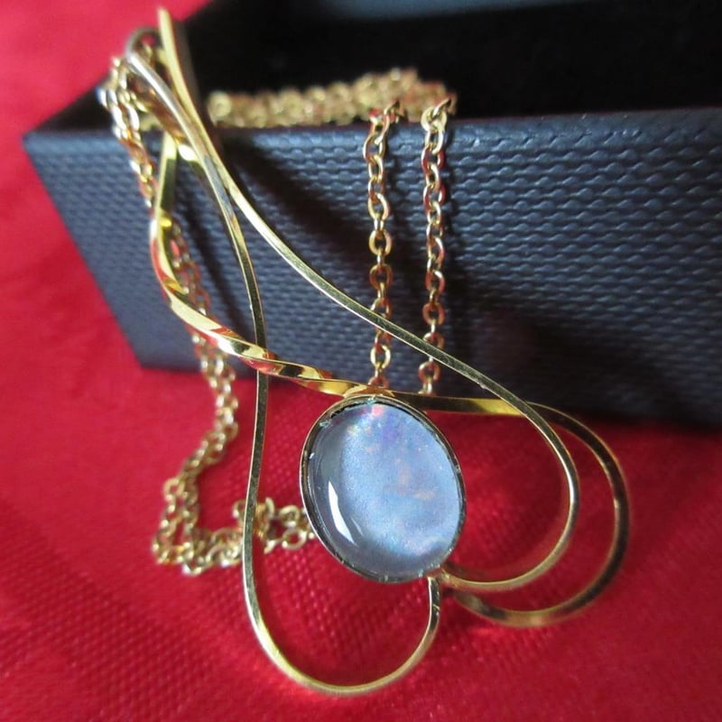 Estate Opal Triplet Sterling Silver Nouveau Style Gilded Pendant (Stamped STG SIL) (approx 45mm x 25mm) On Chain (Boxed)