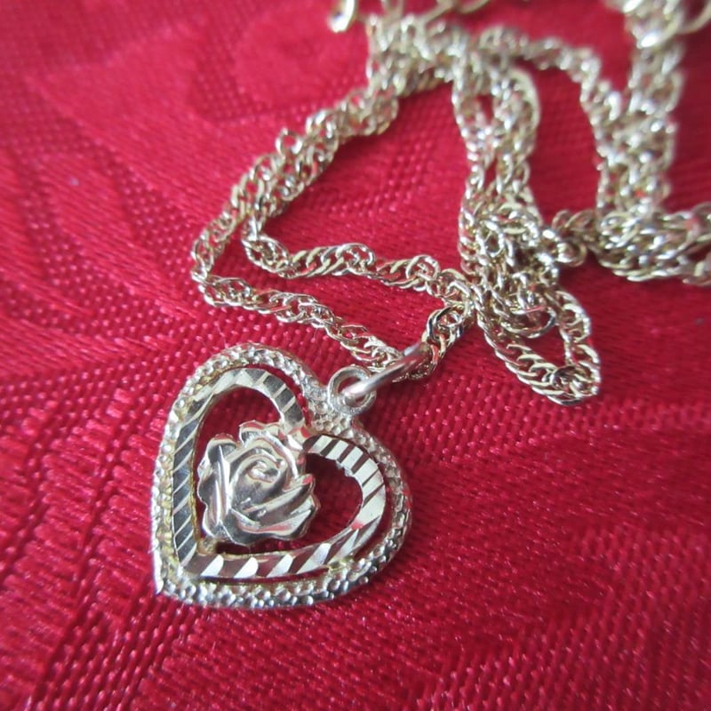 Estate Sterling Silver Gold Lined Carved Rose Heart Pendant (Stamped - refer photos) On Chain (Boxed)