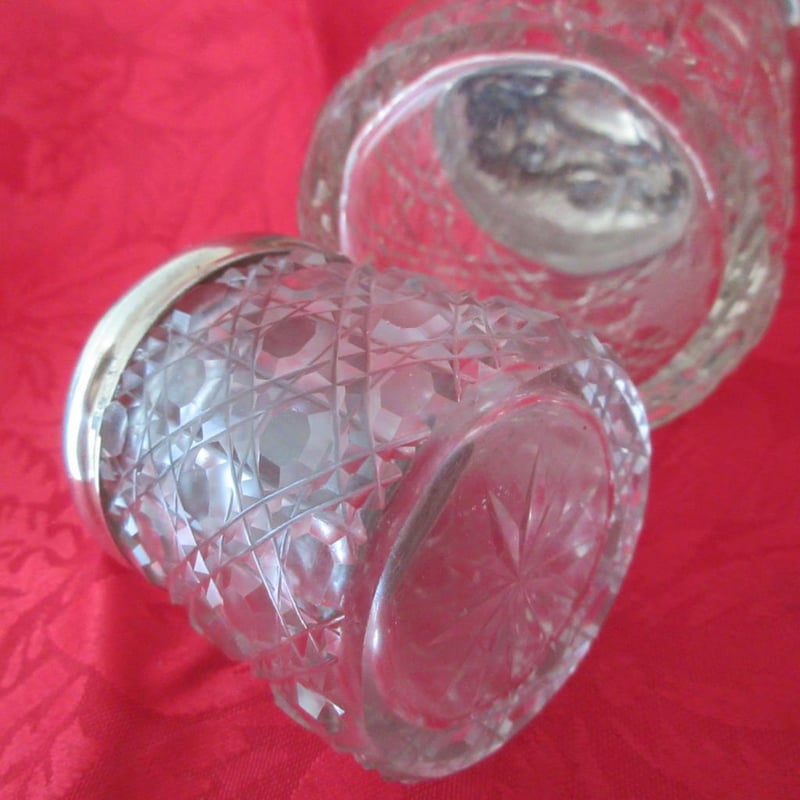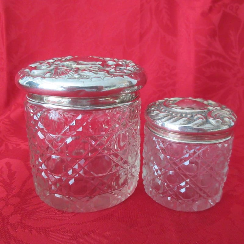 Estate Antique Sterling Silver Lidded (Hallmarks - refer to Photos) Cut Glass Dressing Table Jars (largest approx 10cm tall x 8cm diameter) (Sold as lot and as is)
