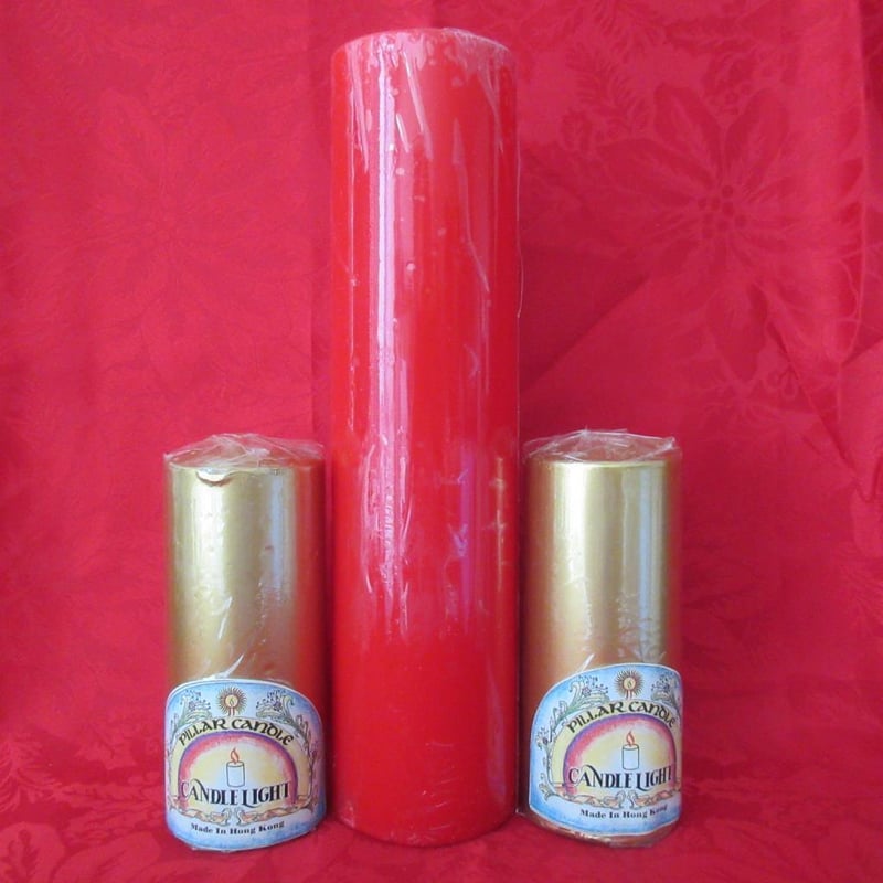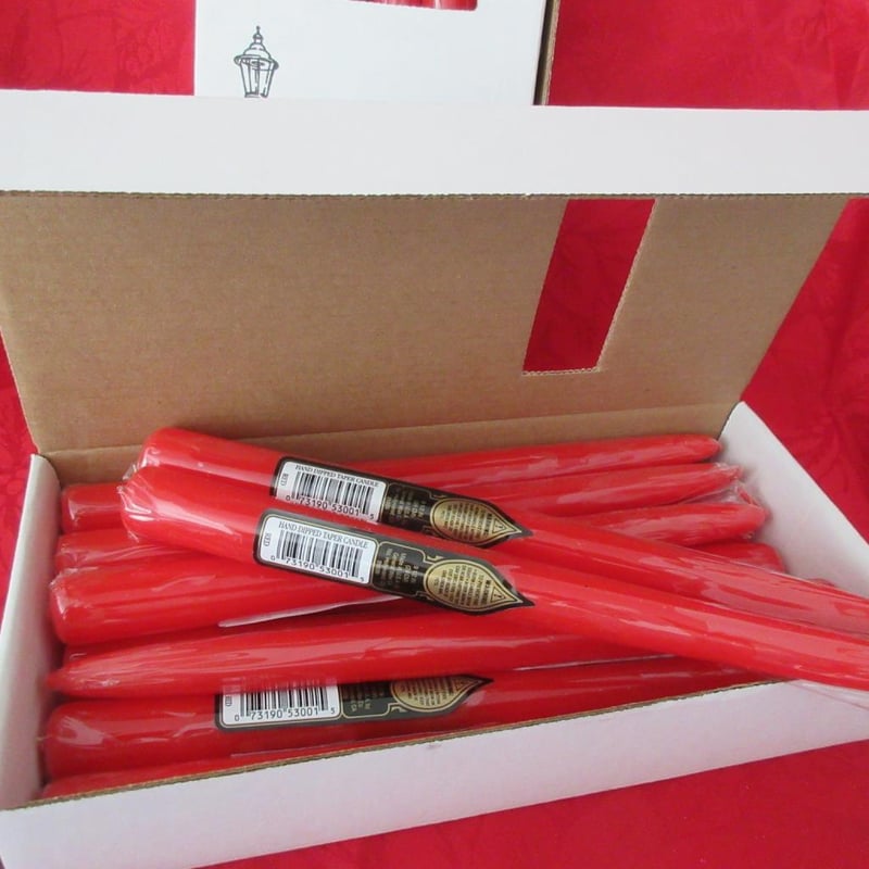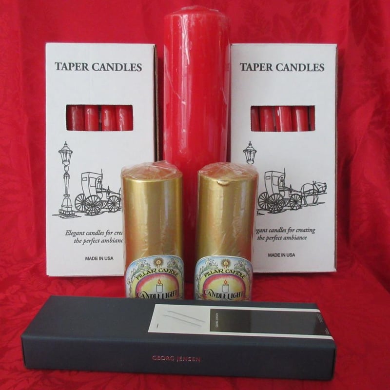 Estate Christmas Candles Including Pair of Georg Jensen White Candles In Original George Jensen Box (box approx 26cm long) + (2) x USA Sets of Twelve Long Red Tapers (ie 24 Candles in total) In Original Boxes (boxes approx 26cm long) + Very Large Red Pillar Candle (approx 31cm tall - still shrink wrapped) + (2) x Gold Pillar Candles (approx 15cm tall each - still shrink wrapped) (Sold as lot)
