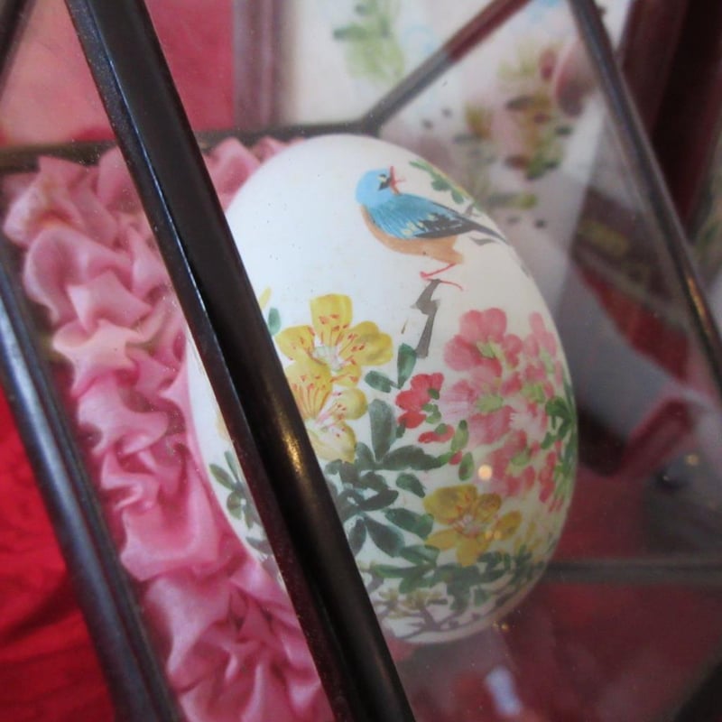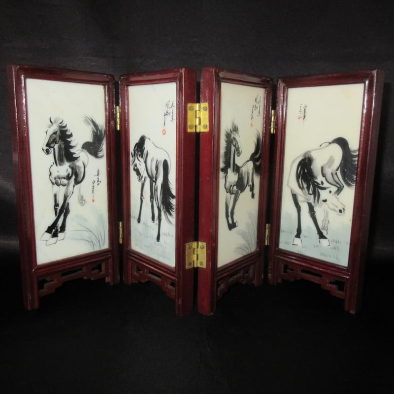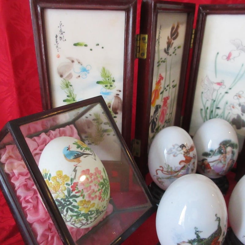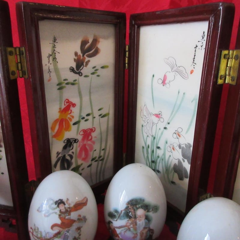 Estate Oriental Hand Painted Items - Set of (6) x Porcelain Eggs on Stands + (2) x Eggs In Bespoke Cases + Signed Four Panel Ceramic Oriental Table Screen (Fish one side and horses reverse) (Sold as lot)