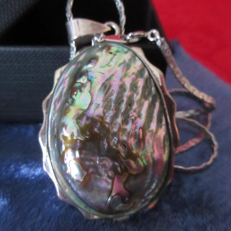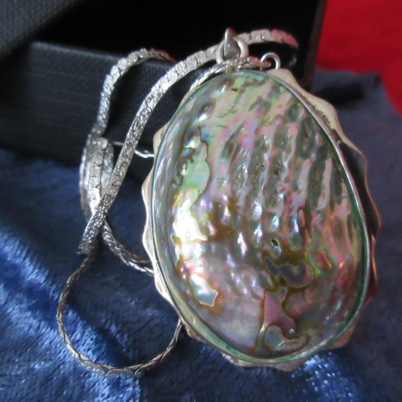 Estate Large Sterling Silver Abalone Shell Pendant (925) (approx 50mm x 35mm) On Chain (Boxed)