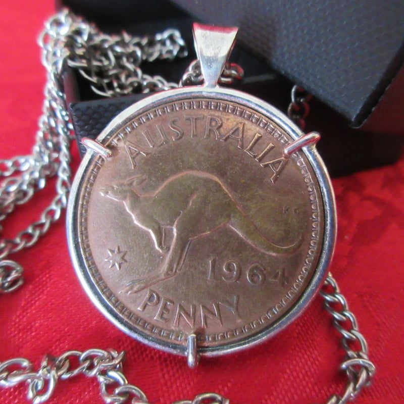Estate Sterling Silver Encased 1964 Australian Penny Pendant (XRF Tested) On Long Chain (Boxed)