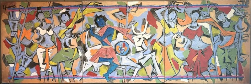 A fifteen foot wide celebration of India’s sacred rivers. The rivers surge and twist in cobalt and emerald, their waters alive with leaping fish, lotuses, and half glimpsed goddesses. Husain paints with the urgency of a film director, each panel a separate explosion of movement that resolves into one majestic whole. Among the largest triptychs Husain ever created and one of the most ambitious works of his career.
