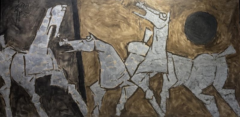 Husain’s limited palette and vigorous brushwork heighten the drama of the composition, while the distorted anatomy and rhythmic repetition emphasize motion over realism. The horse, a recurring motif in Husain’s oeuvre, becomes a symbol of freedom, conflict, and the unstoppable force of life, positioning this work among the most iconic and sought-after expressions of his modernist vision.