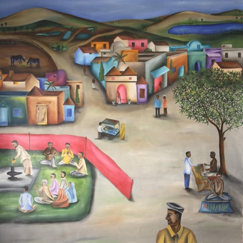 This narrative work by Bhupen Khakhar reflects his distinctive engagement with everyday Indian life, rendered through simplified forms and a calm, luminous palette. The composition unfolds as a quiet social tableau, transforming ordinary moments into deeply human narratives.