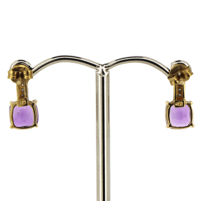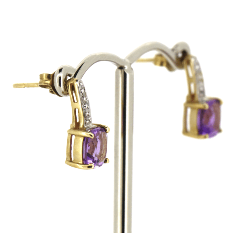 9K YELLOW GOLD, AMETHYST AND DIAMOND, EARRINGS.