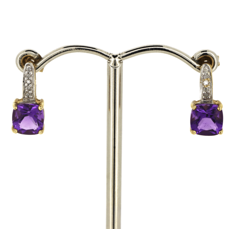 The Earrings Feature, 2 Cushion Cut, Amethyst - Claw Set. Encompassing The Hooks Are, 10 Round Brilliant Cut, Diamonds - Bead Set. The Earrings Feature Standard Butterfly Clasps. Condition: Pre-Owned.