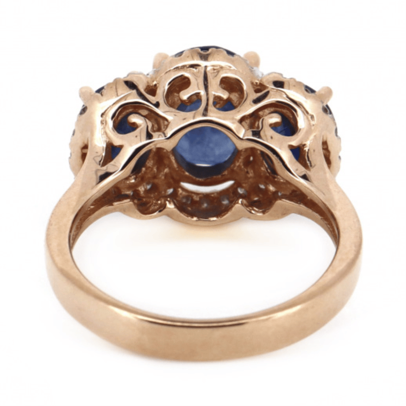 14K ROSE GOLD, BLUE SAPPHIRE AND DIAMOND, HALO TRILOGY RING. The Design Features 3 Oval Cut, Dark Blue, Sapphires (3.26Ct Tsw, Heavily Included, Heat Enhanced), 4 Claw Set. Surrounding The Design In A Halo Are 32 Round Brilliant Cut Diamonds (0.16Ct Tdw, Colour, Clarity), Claw Set. Ring Size K. Valuations Provided by an Independent Third-Party Professional Not Directly Associated With Lloyds Auctions at AUD $$12,000.00This valuation has been conducted by an independent third-party professional. The valuation amount is an assessment by the issuing valuer and does not reflect the auction value of the item. Any inquiries regarding the valuation should be directed to the issuing valuer (refer to contact details on the certificate), as Lloyds Auctions has no affiliation or influence over the valuation, the valuer, or the stated amount. Condition: Good - Refer Images 0645909+1610