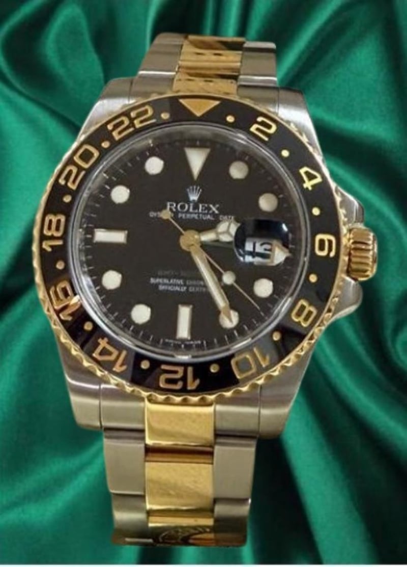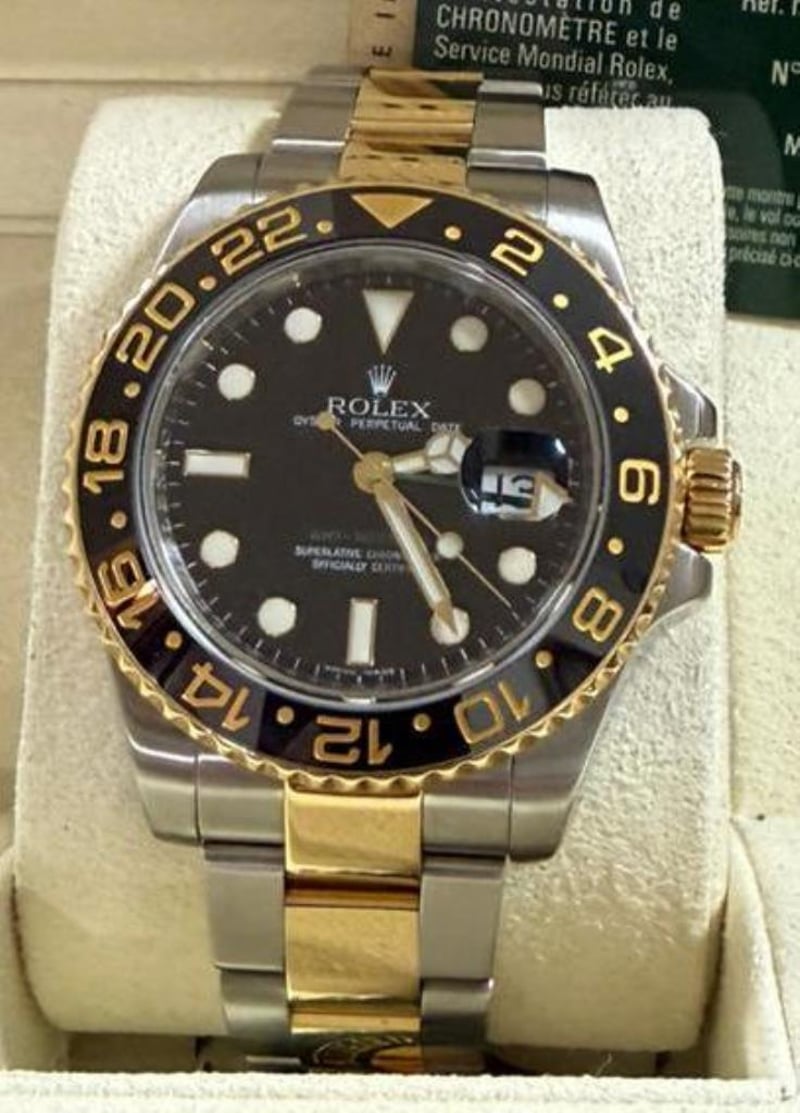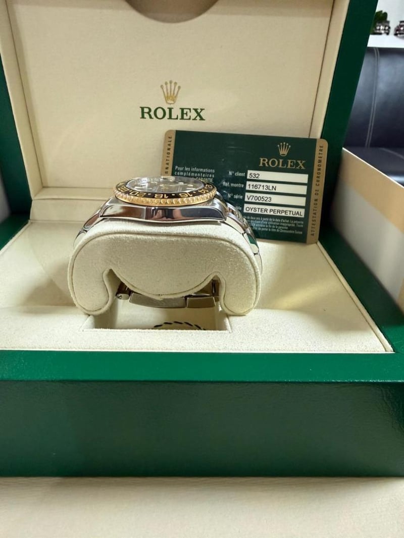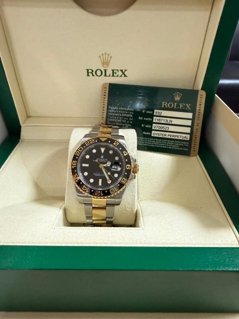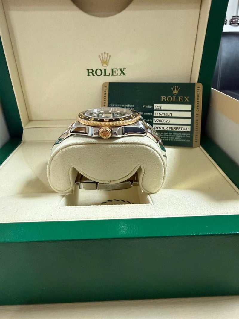 ROLEX GMT-MASTER II Price Guide - $18,500 - $20,000 Brand: Rolex Model: GMT-Master II Reference: 116713LN Movement: Automatic Case Material: Gold/Steel Case Diameter 40mm Bracelet Material: Gold/Steel Water Resistance: 10 ATM Bezel material Ceramic Crystal: Sapphire Crystal Dial: Black Box: Yes Papers: Unknown Condition: Good - Refer Images 488439+2