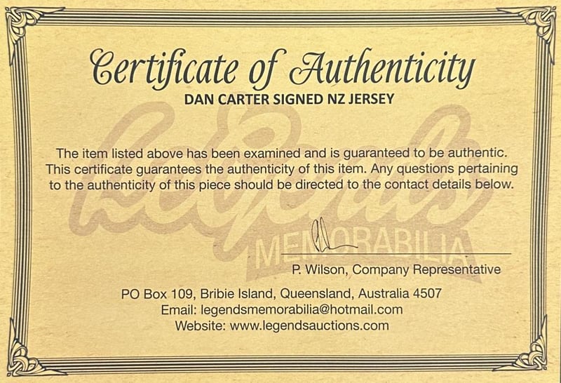 DAN CARTER SIGNED NZ JERSEY A Nz Jersey Personally Signed By Dan Carter. Daniel Carter Is A New Zealand Retired Rugby Union Player. Carter Played For The Crusaders In Super Rugby And For The All Blacks. The Item Is Accompanied By A Certificate Of Authenticity.Condition: Good - Refer To Images585045+3