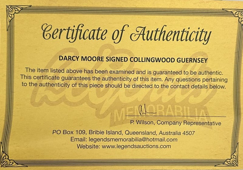 DARCEY MOORE SIGNED COLLINGWOOD GUERNSEY A Collingwood Guernsey Personally Signed By Darcey Moore. Darcy Moore Is An Australian Rules Footballer Who Currently Plays For The Collingwood Football Club. The Item Is Accompanied By A Certificate Of Authenticity.Condition: Good - Refer To Images585045+5