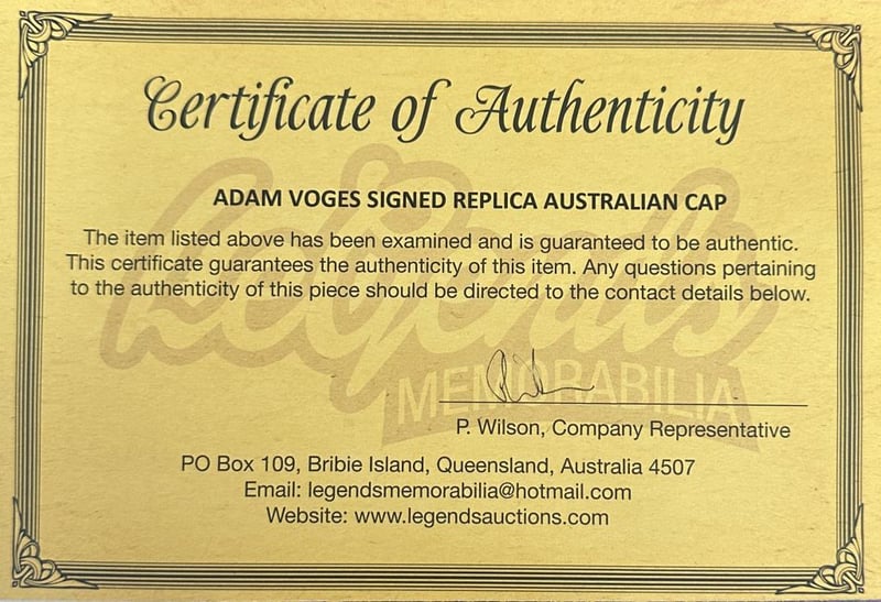 A Replica Australia Test Cap Personally Signed By Adam Voges. Adam Voges Is An Australian Cricket Coach And Former Cricketer Who Played For The Australian National Team At Test, One Day International, And Twenty20. The Item Is Accompanied By A Certificate Of Authenticity.