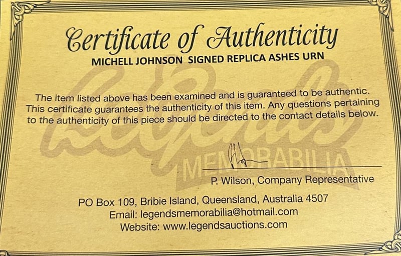 A Replica Ashes Urn Personally Signed By Mitchell Johnson. Mitchell Johnson Is A Former Australian Cricketer Who Played All Forms Of The Game For His National Side. The Item Is Accompanied By A Certificate Of Authenticity.