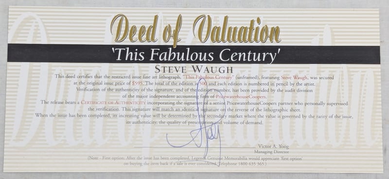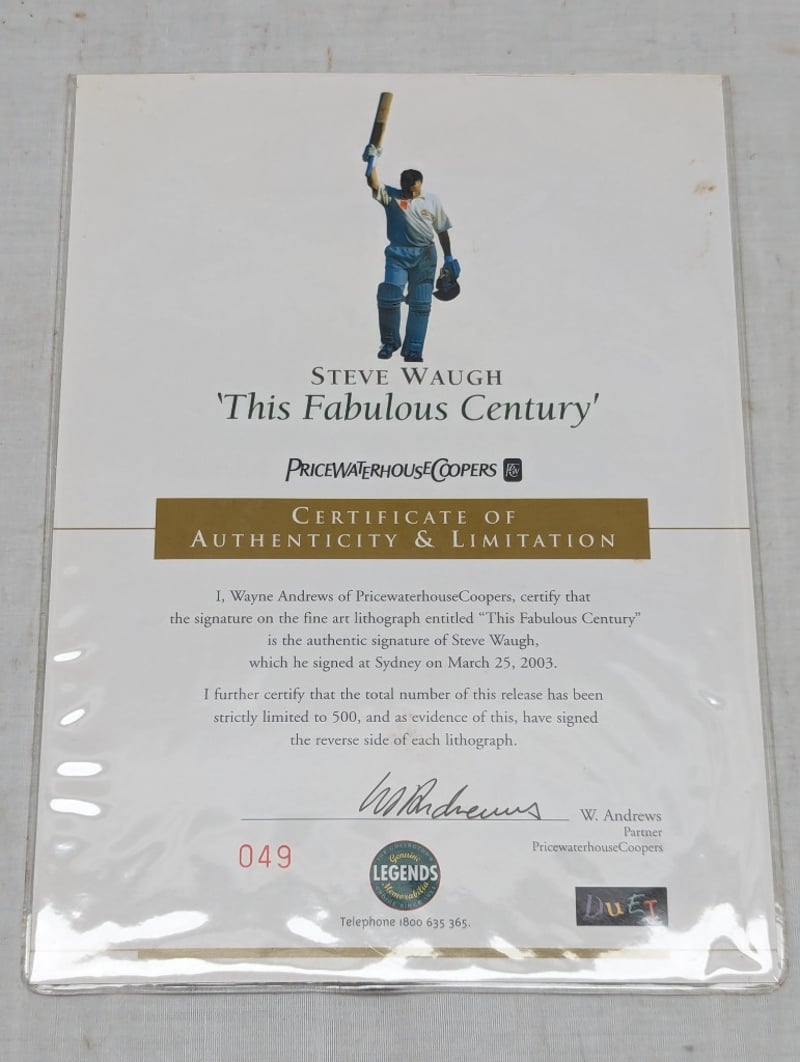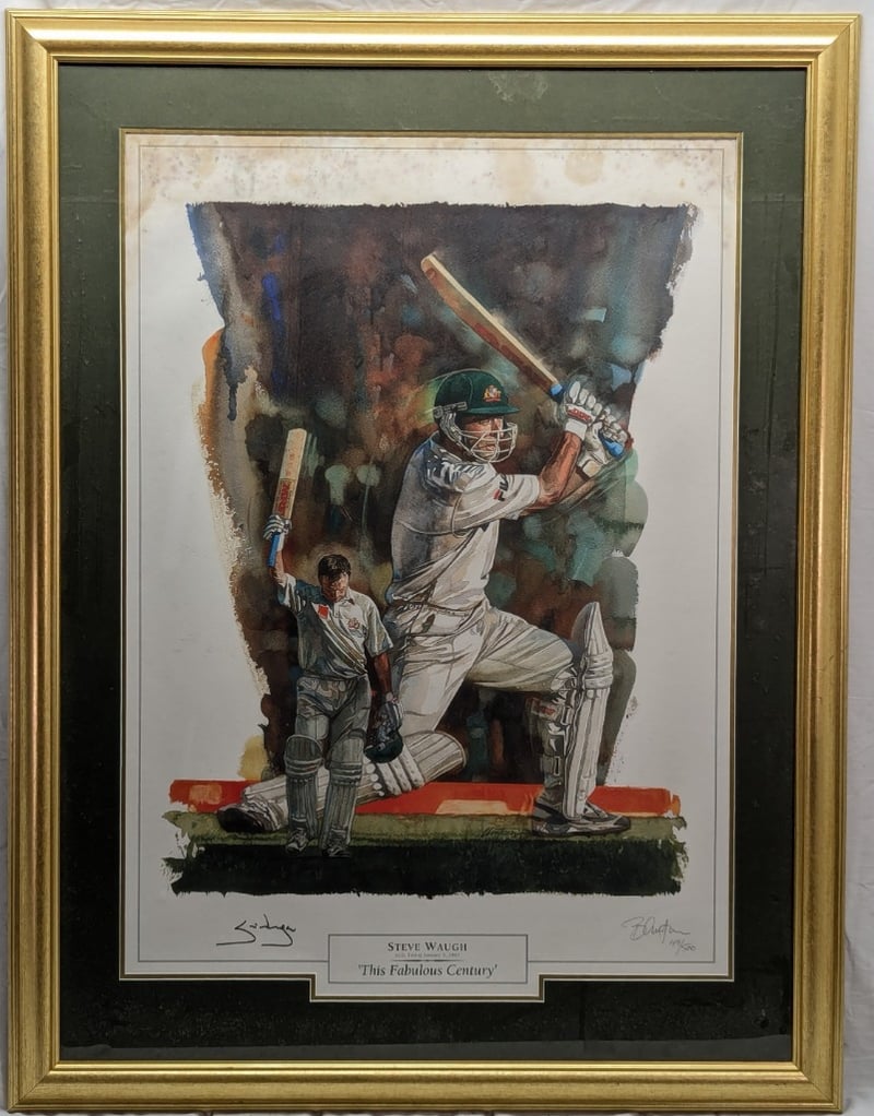 LIMITED EDITION STEVE WAUGH AND BRIAN CLINTON SIGNED 'THIS FABULOUS CENTURY' LITHOGRAPHItem Size: Height: 100cm, Width: 76cmEdition Number: 49/500Includes Certificate Of Authenticity And Limitation And Deed Of ValuationWater Marks On Upper ArtworkCondition: Good - Refer To Images12B587761+4