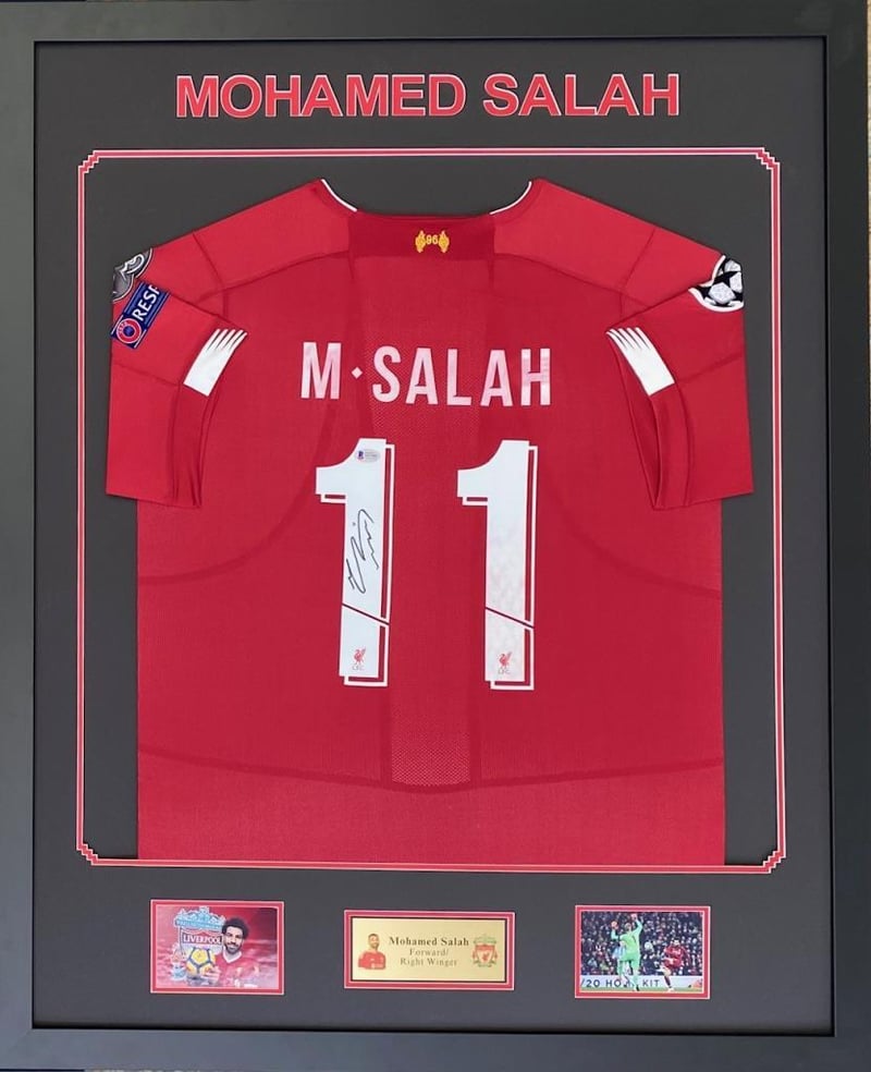 MOHAMED SALAH PERSONALLY SIGNED LIVERPOOL FOOTBALL CLUB JERSEY Framed Using Double Mats, 2 Unsigned Photographs And A Plaque. Hand Signed By Mohamed Salah Using A Black MarkerAccompanied By A Certificate Of Authenticity From Beckett Size: 109cm(H)x2cm(W)x89cm(L)Condition: Good - Refer To Images488404+5