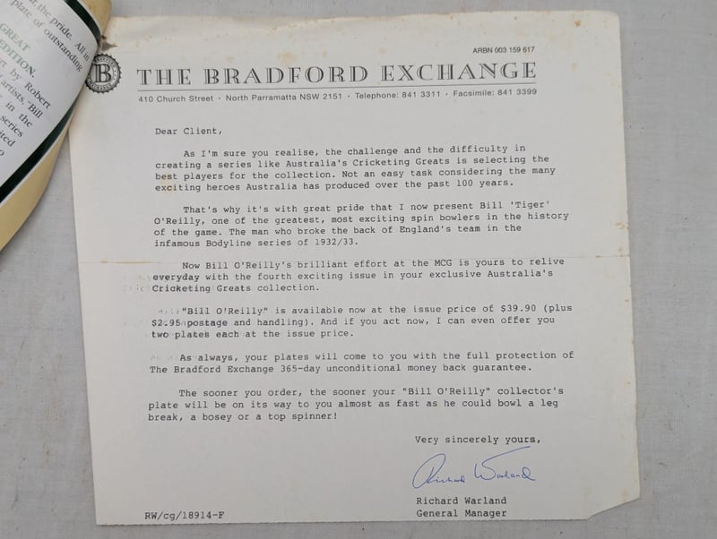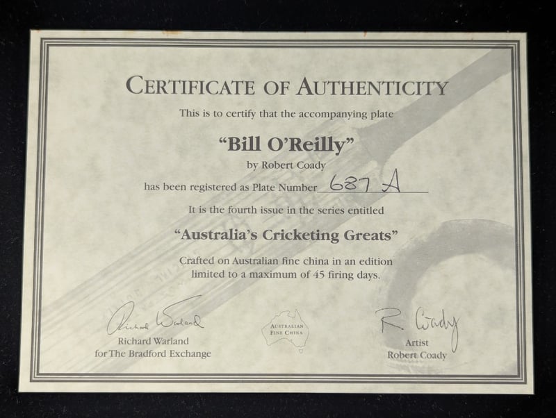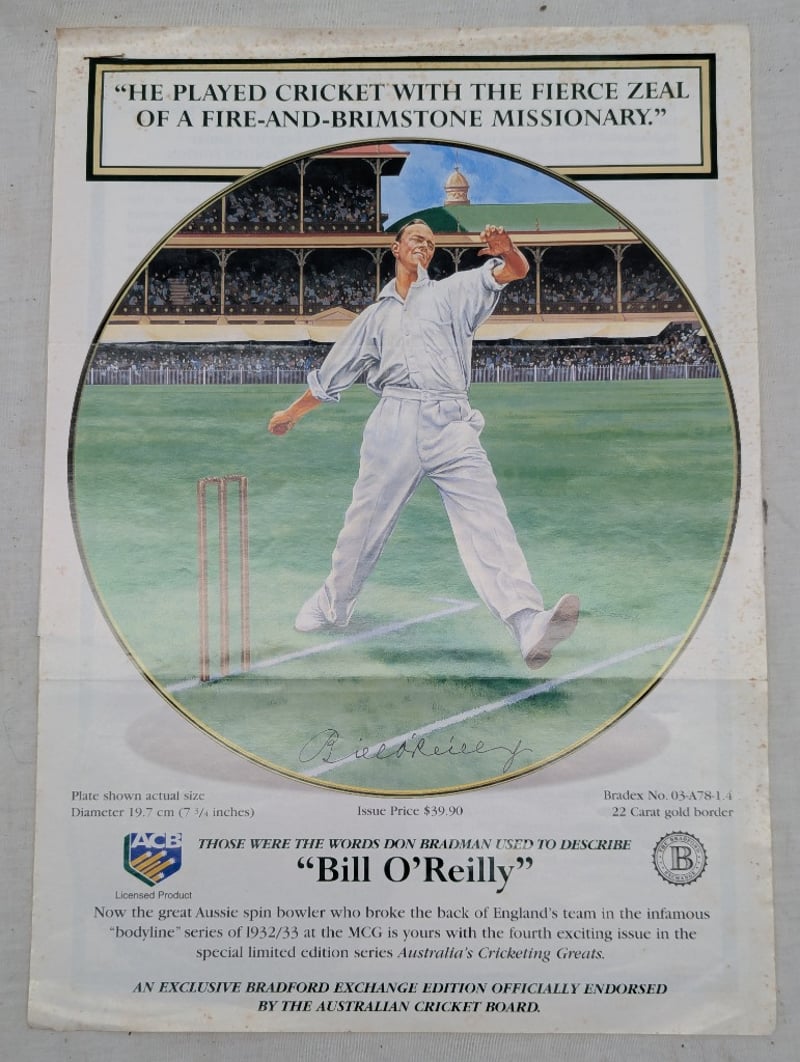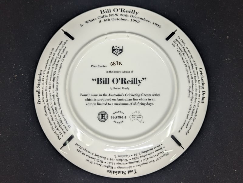LIMITED EDITION AUSTRALIAN CRICKETING GREATS COMMEMORATIVE PLATE, ''BILL O'REILLY''