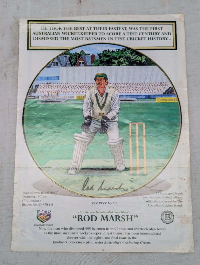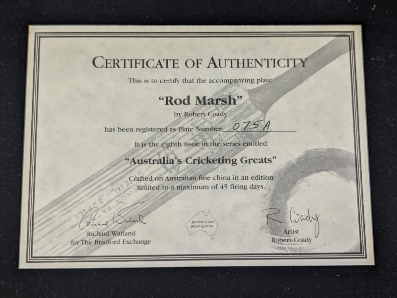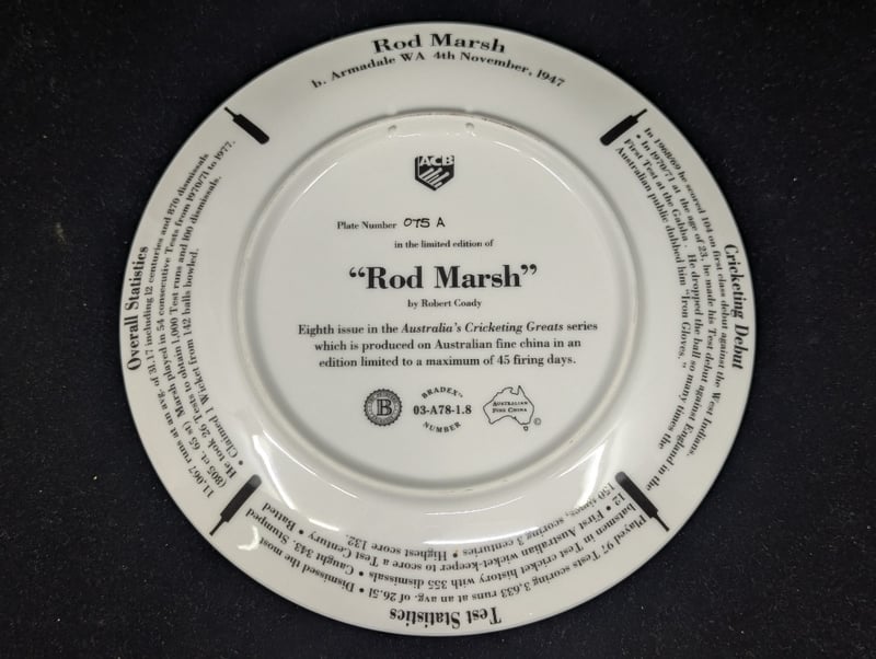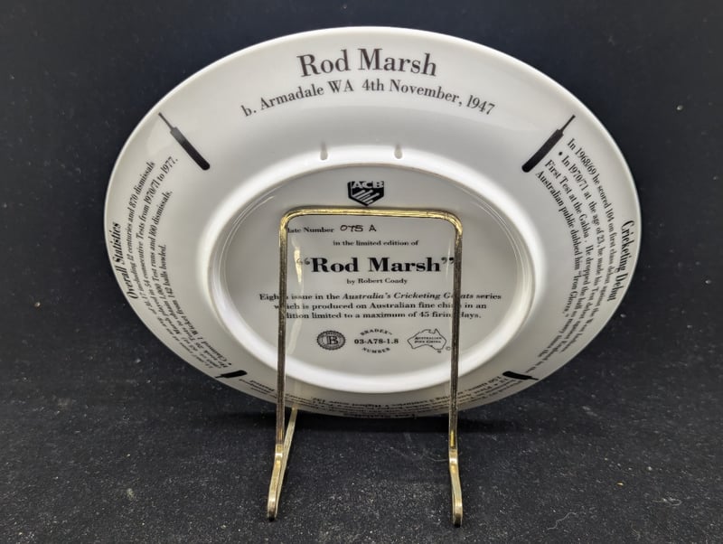LIMITED EDITION AUSTRALIAN CRICKETING GREATS COMMEMORATIVE PLATE, ''ROD MARSH'' Plate Number: 075A, Plate Diameter: 20Cm Includes Certificate Of Authenticity Condition: Good - Refer To Images 5B 587766+4
