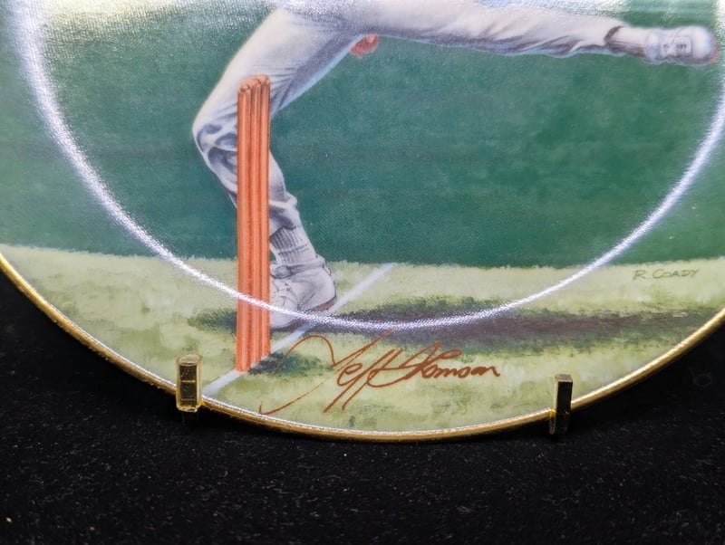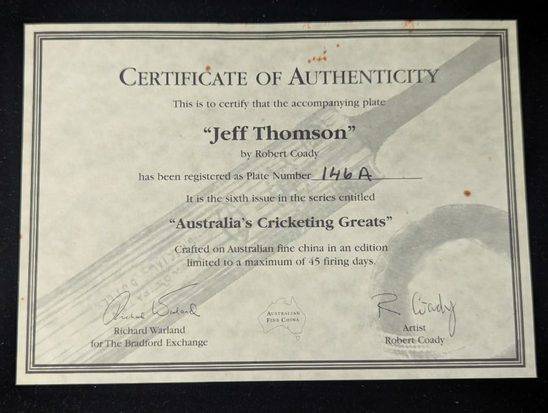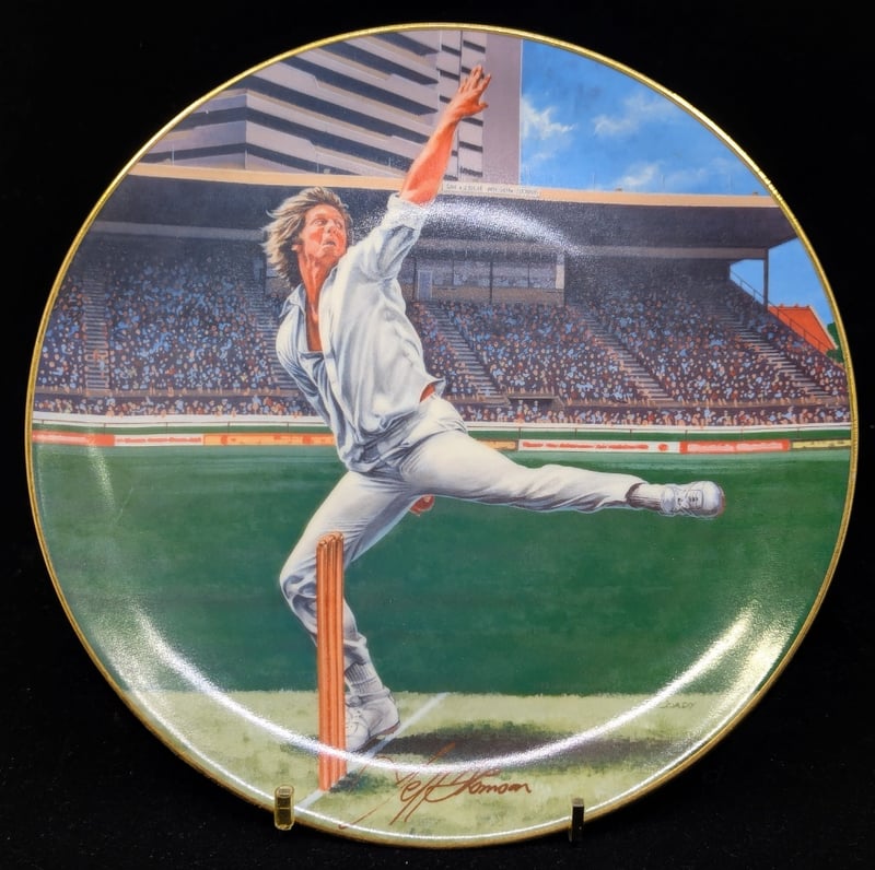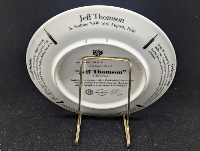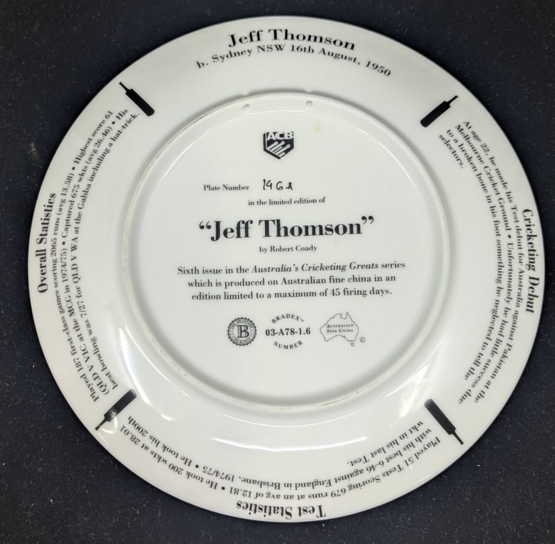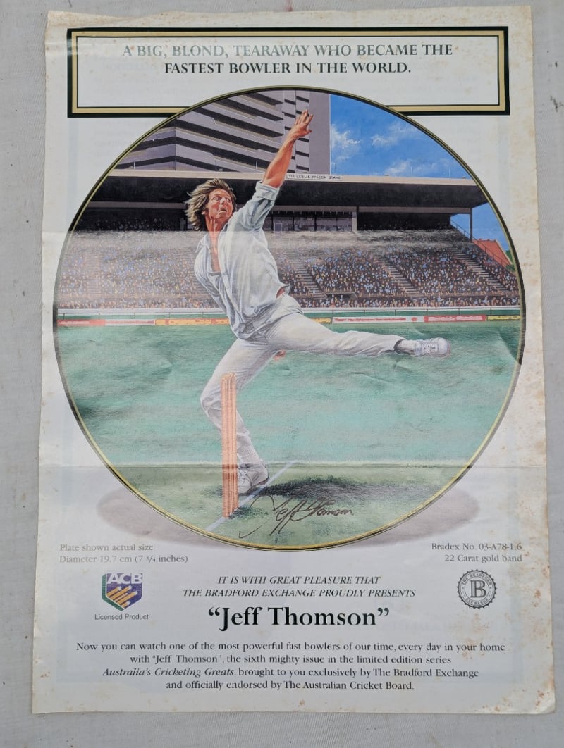 LIMITED EDITION AUSTRALIAN CRICKETING GREATS COMMEMORATIVE PLATE, ''JEFF THOMSON'' Plate Number: 146A, Plate Diameter: 20Cm Includes Certificate Of Authenticity Condition: Good - Refer To Images 5B 587766+7