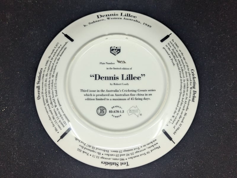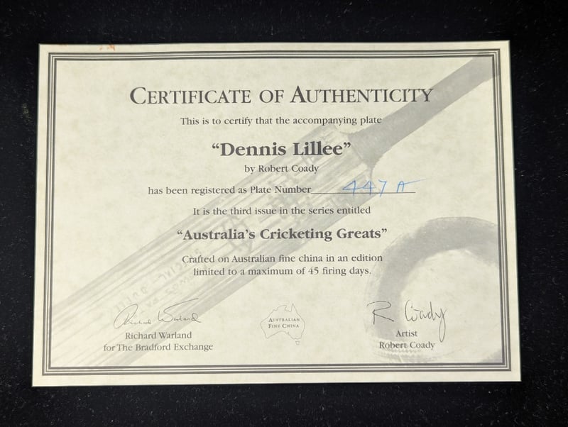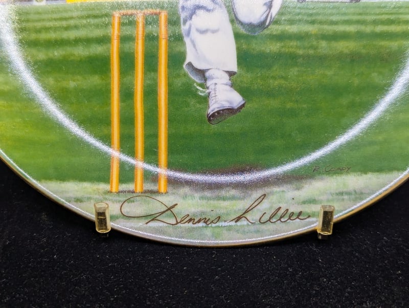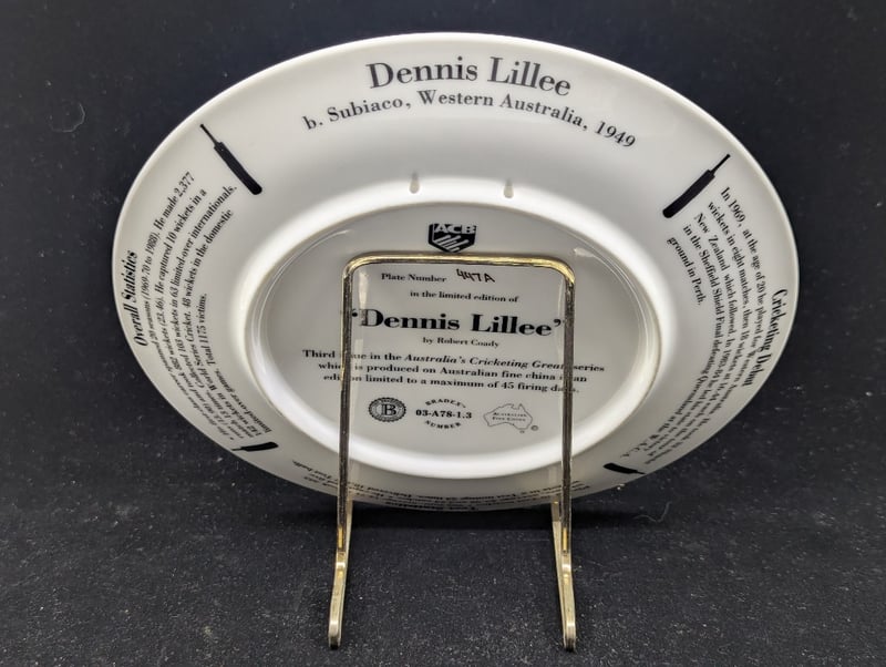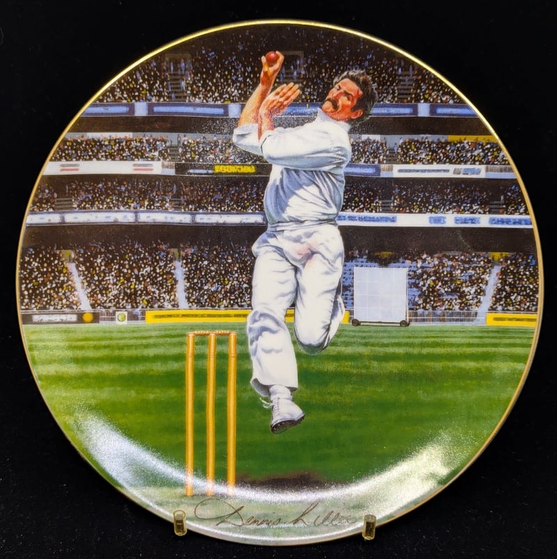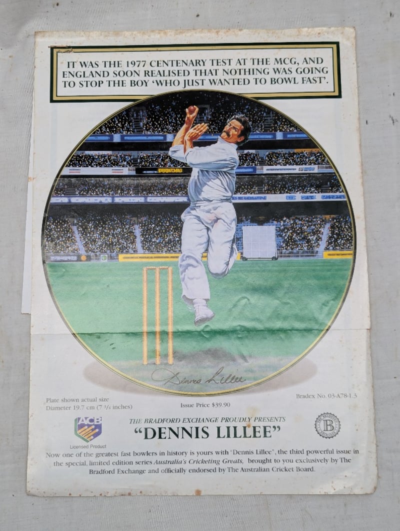 LIMITED EDITION AUSTRALIAN CRICKETING GREATS COMMEMORATIVE PLATE, ''DENNIS LILLEE'' Plate Number: 447A, Plate Diameter: 20Cm Includes Certificate Of Authenticity Condition: Good - Refer To Images 5B 587766+8