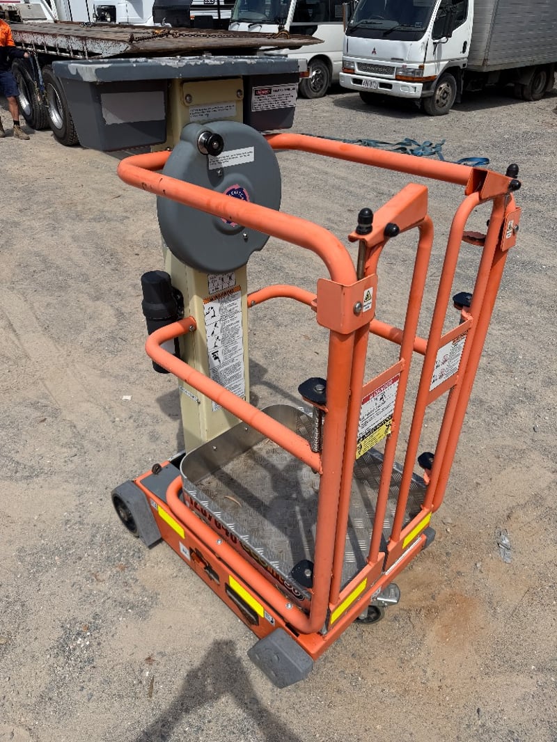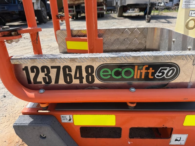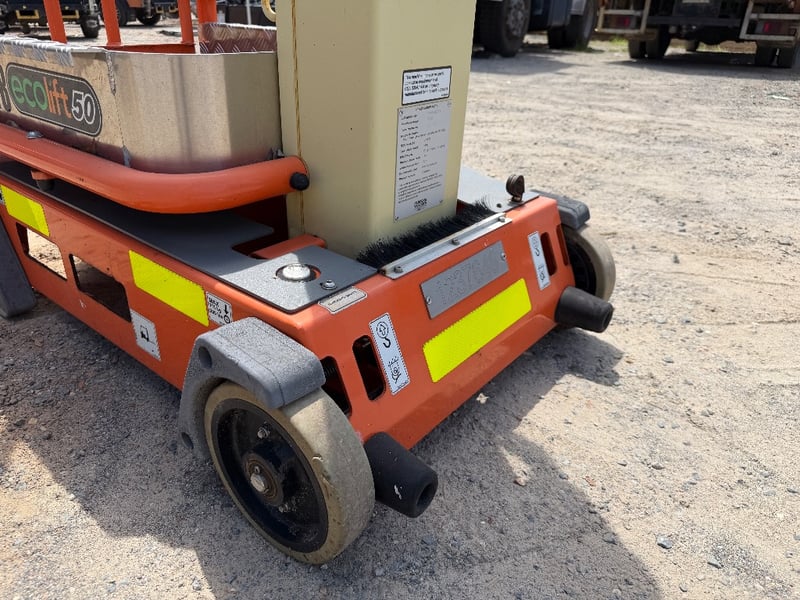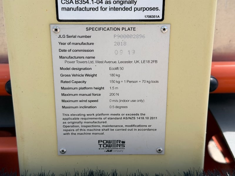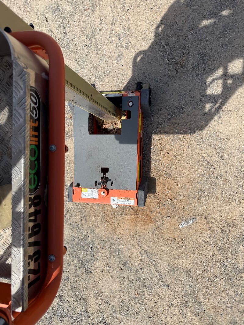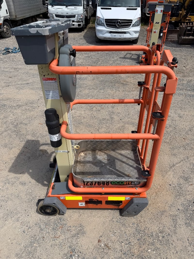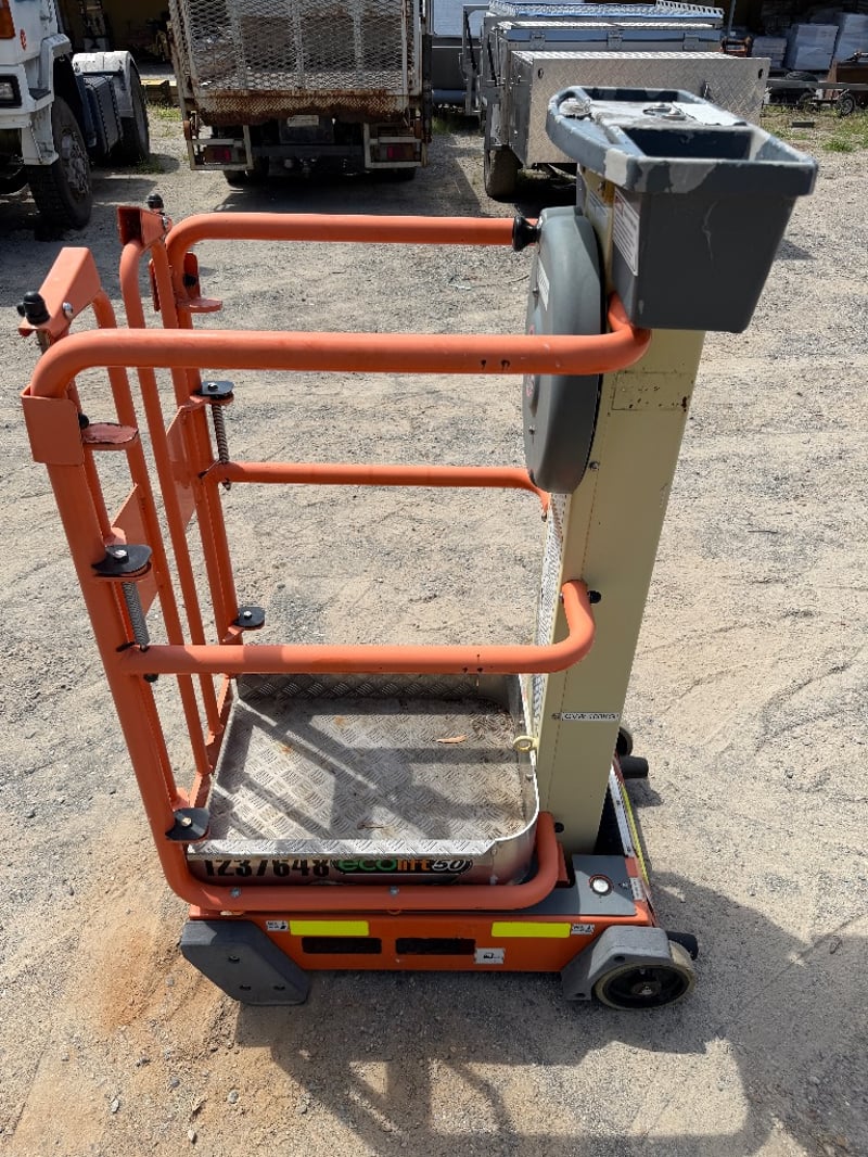 JLG EcoLift 50, non-powered, push-around vertical lift designed as a safer, more ergonomic alternative to ladders for low-level indoor work.Key Features & Specifications:Machine Height: 5ft, 1in or 155cmMax Platform Capacity: 330lb or 150kgMax Platform Height: 5ft or 152cmPower-Free: Operates without batteries, hydraulics, or oil, making it ideal for noise-sensitive or clean areas.Ergonomic & Safe: Allows 360-degree, hands-free work, eliminating the need for three points of contact like a ladder, with auto-locking brakes and a safety latch on the crank.Easy to Use: A simple hand crank raises the platform in about 11 seconds, with a stored power system requiring minimal effort.Compact & Lightweight: Narrow enough to fit through standard doorways and light enough to be moved in elevators, with protective wall bumpers.Low Maintenance: Fewer components mean lower maintenance costs and more uptime.Capacity: Handles up to 330 lbs (150 kg) for tools and materials. Serial No.: P900002896(Key #NoKey Carrara)