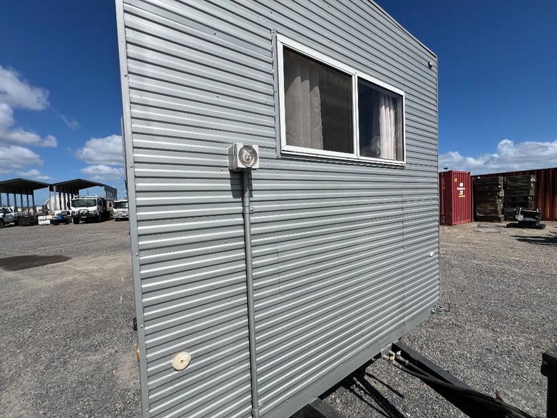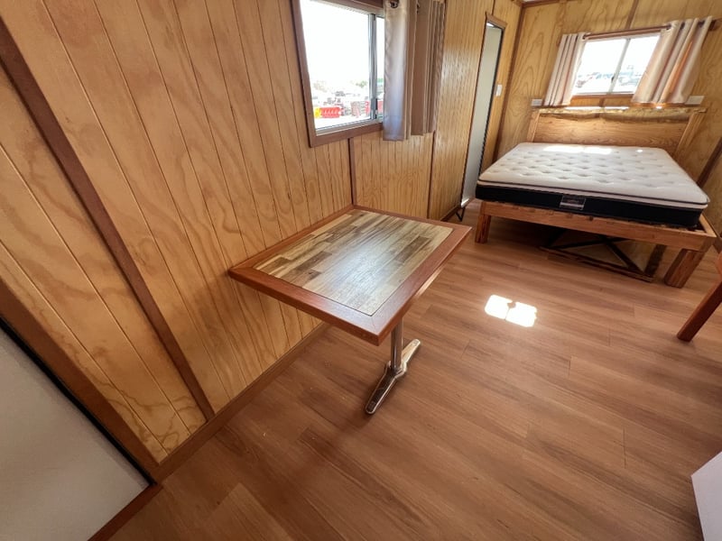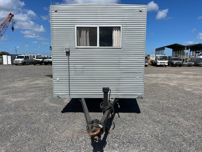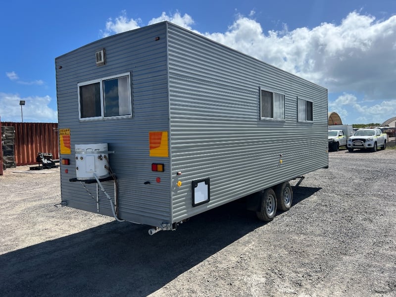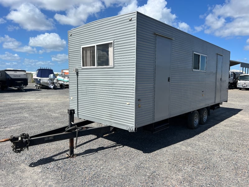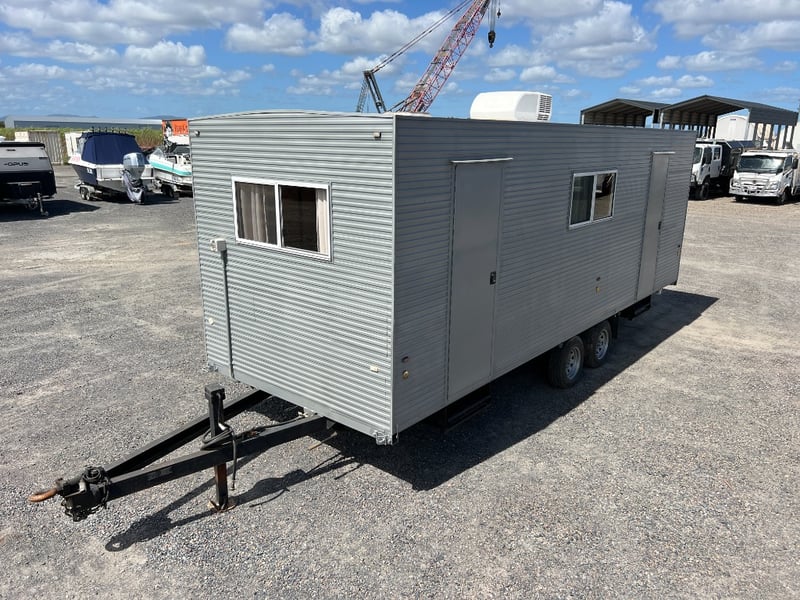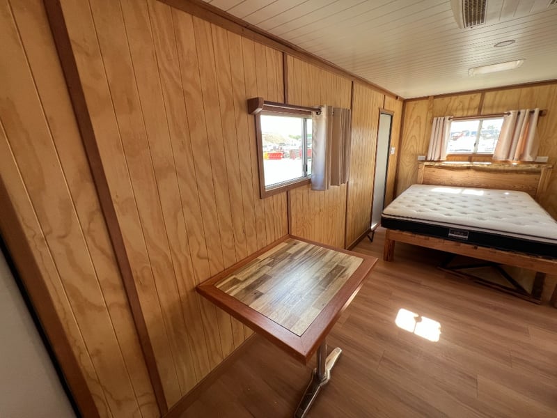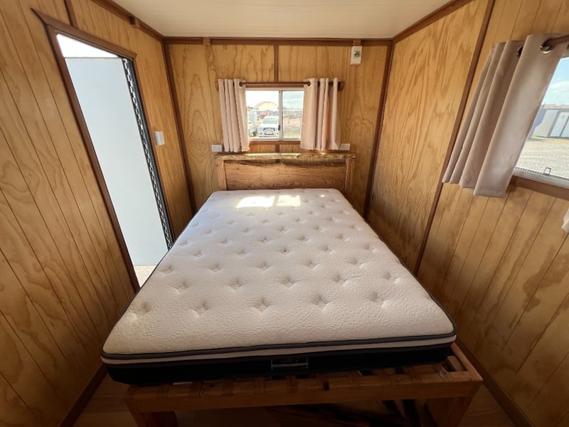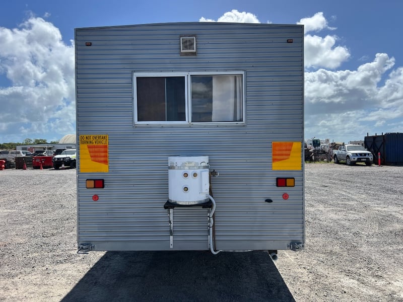 Description: Inside is all Hand Crafted Wood work, Timber Double Bed, Table Tops, Kitchen Bench with Basin, Fridge, Air Conditioning, Toilet, Hot Water Shower, Stabilising Legs, Requires Power and Water to be Functional.