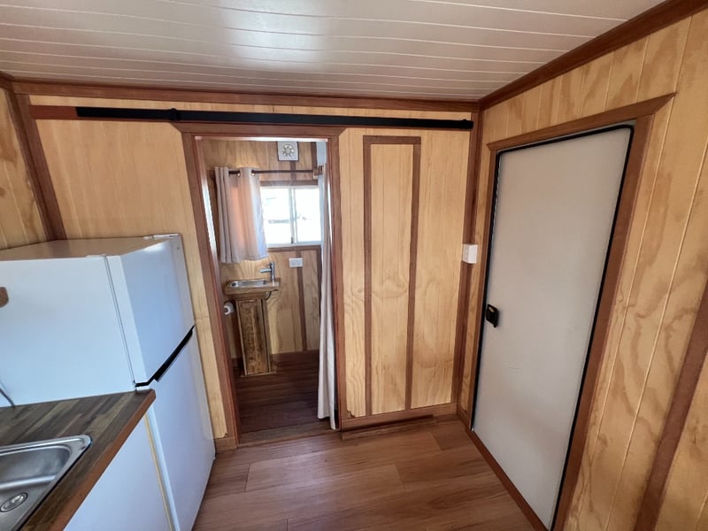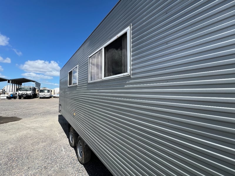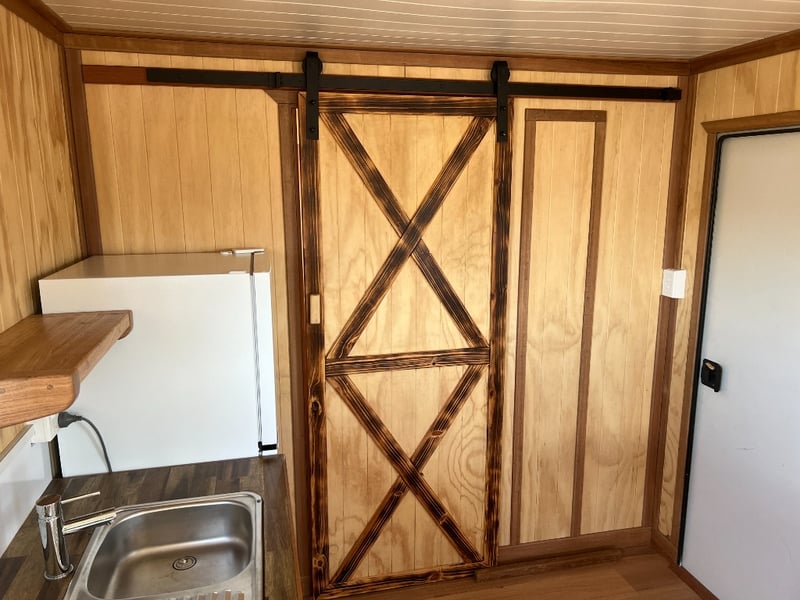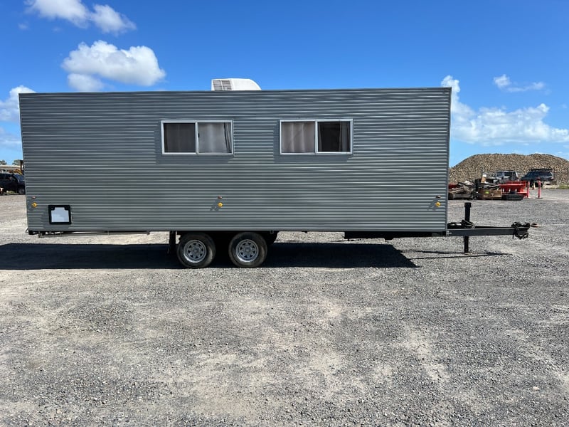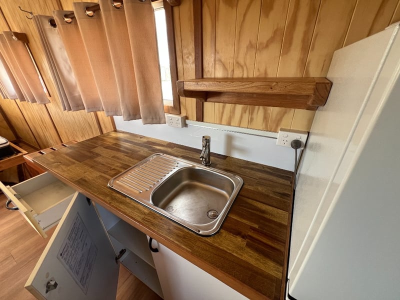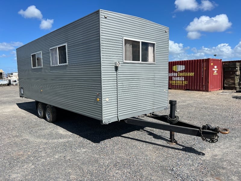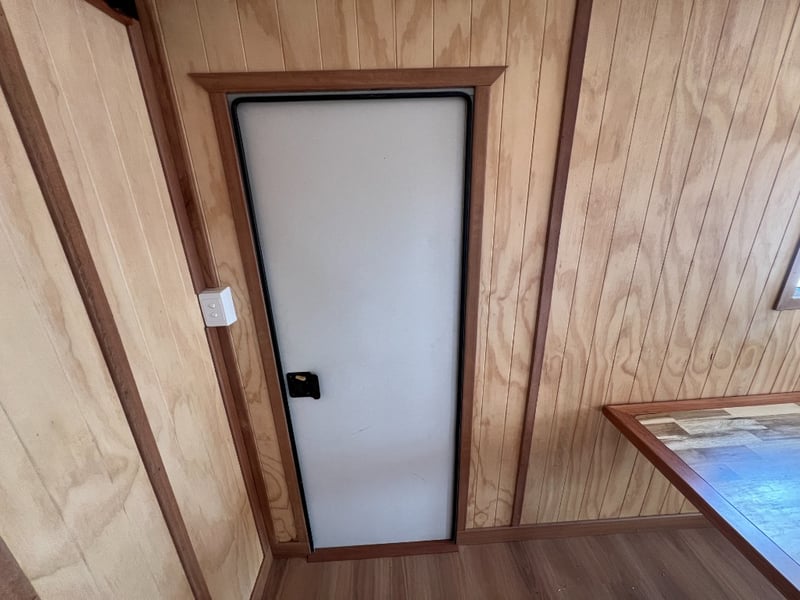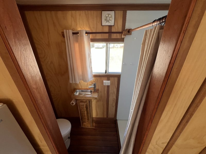 Description: Inside is all Hand Crafted Wood work, Timber Double Bed, Table Tops, Kitchen Bench with Basin, Fridge, Air Conditioning, Toilet, Hot Water Shower, Stabilising Legs, Requires Power and Water to be Functional.