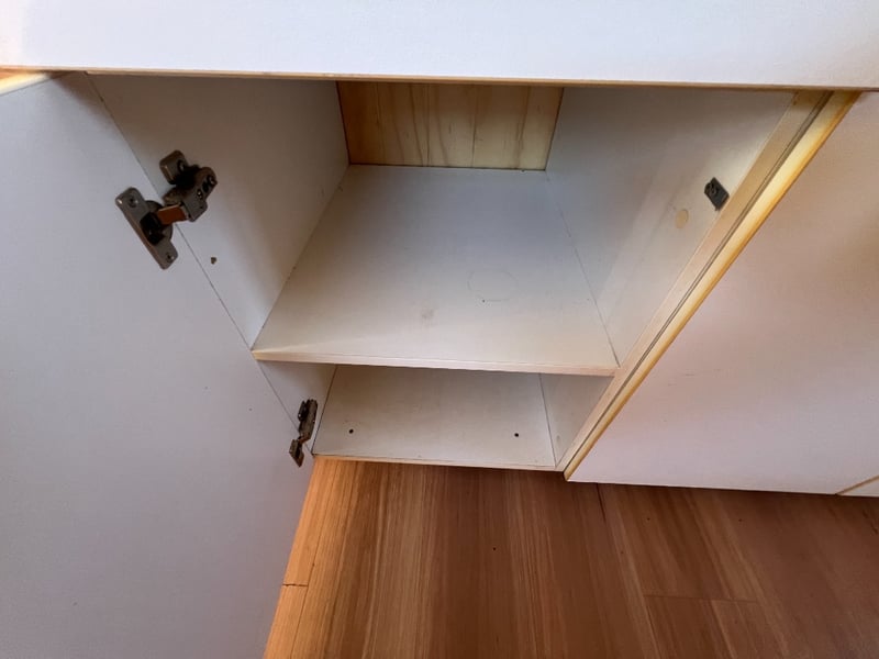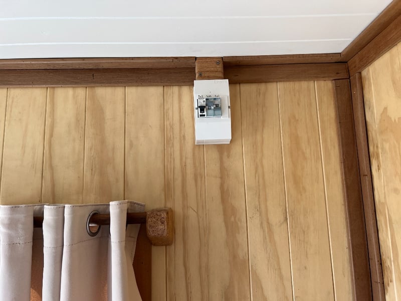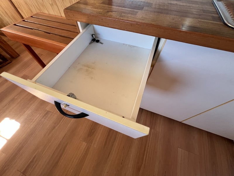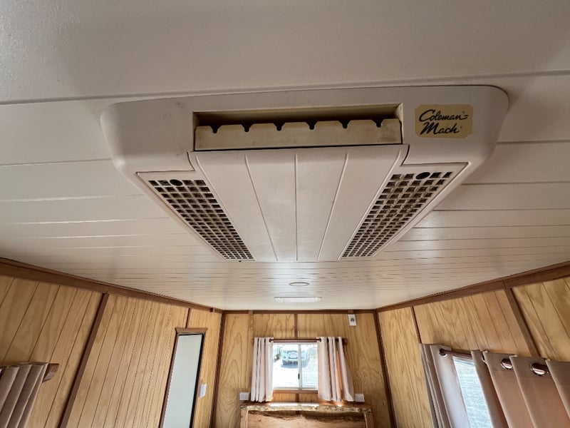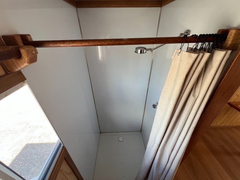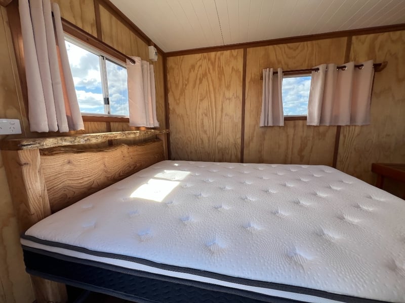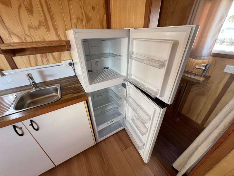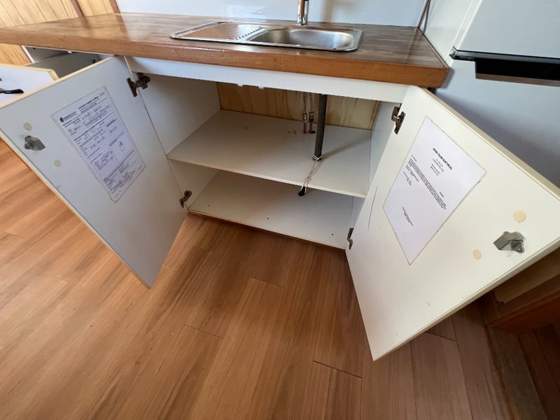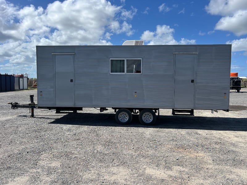Description: Inside is all Hand Crafted Wood work, Timber Double Bed, Table Tops, Kitchen Bench with Basin, Fridge, Air Conditioning, Toilet, Hot Water Shower, Stabilising Legs, Requires Power and Water to be Functional.