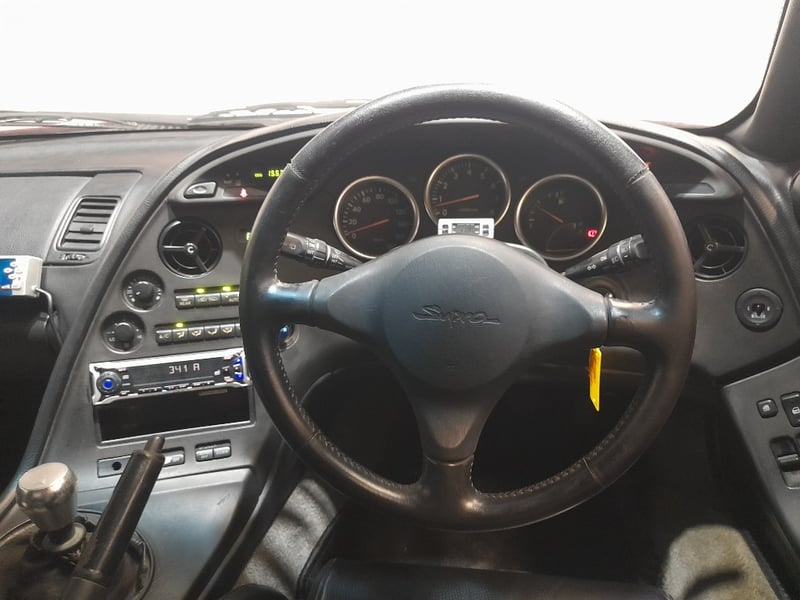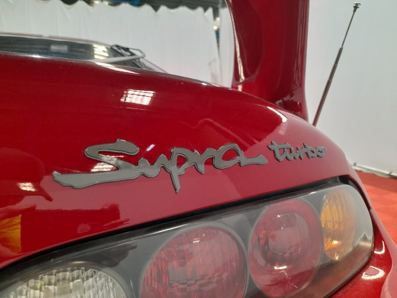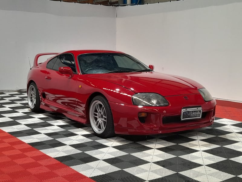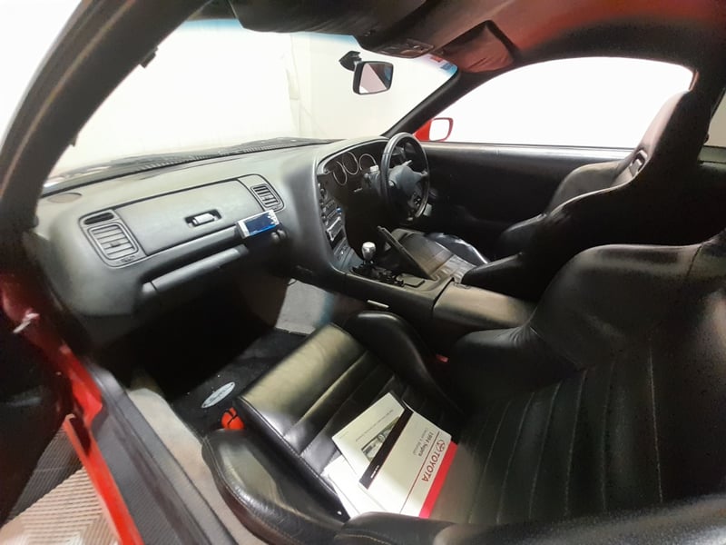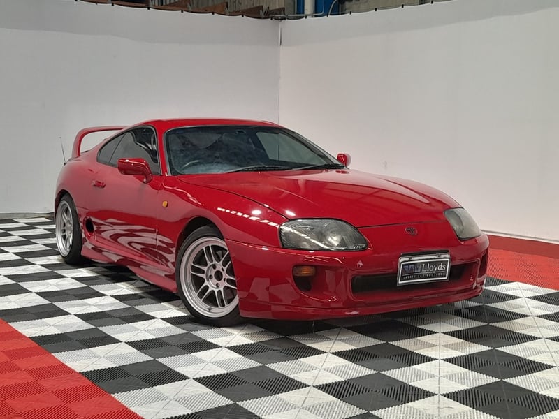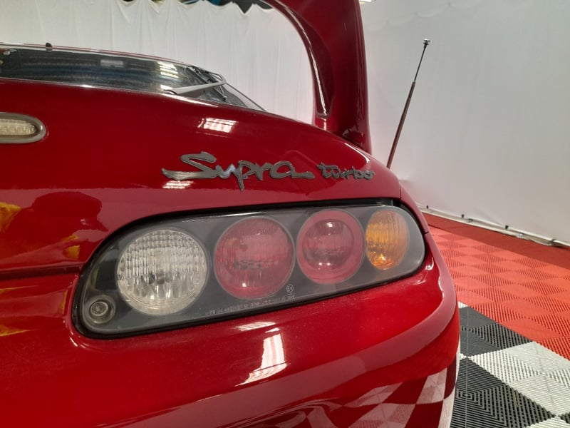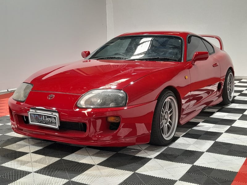 1993 Toyota Supra RZ hardtop finished in Renaissance Red, featuring the desirable factory six-speed manual transmission. Rear-wheel drive configuration powered by the legendary 3.0-litre twin-turbocharged inline-six petrol engine. Odometer indicating 155,316 kilometres.