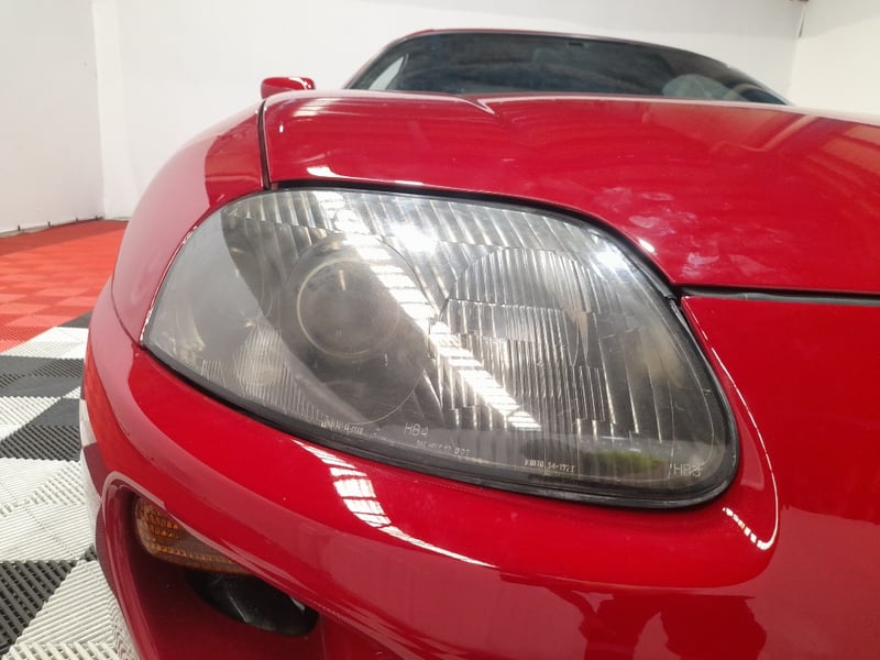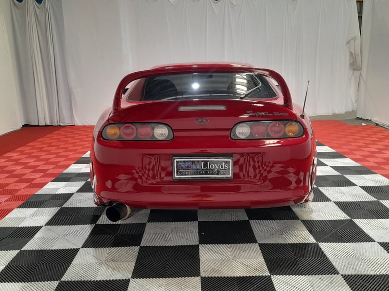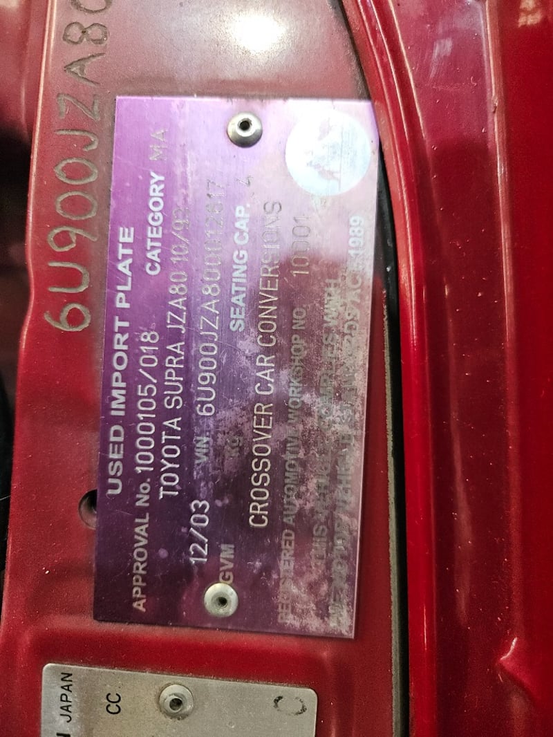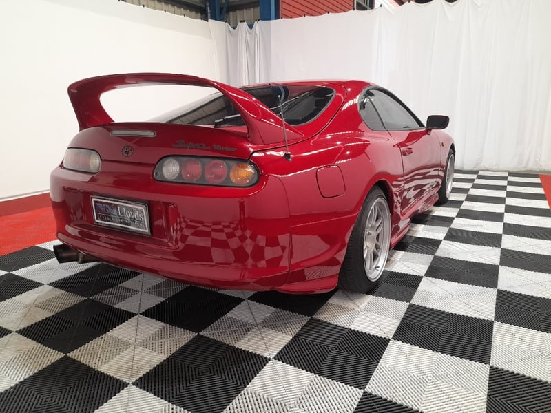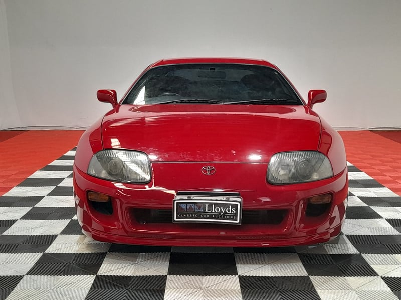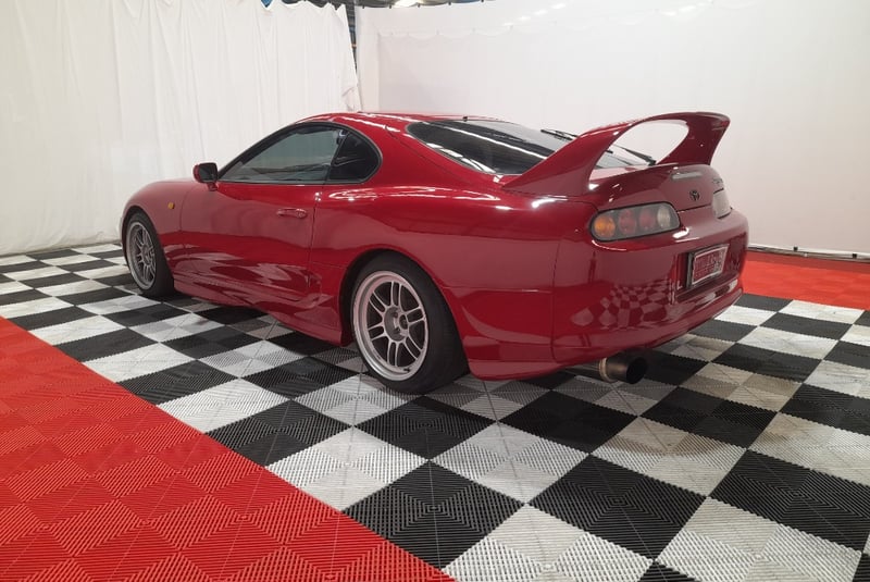 1993 Toyota Supra RZ hardtop finished in Renaissance Red, featuring the desirable factory six-speed manual transmission. Rear-wheel drive configuration powered by the legendary 3.0-litre twin-turbocharged inline-six petrol engine. Odometer indicating 155,316 kilometres.