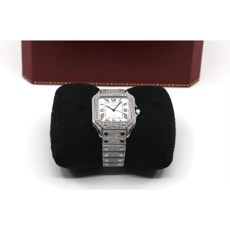 Cartier Stainless Steel, Santos Medium Watch. 33mm, Aftermarket Diamonds, Mechanical Movement. New condition, with aftermarket diamonds. Battery is working. Comes with Cartier box, no papers.